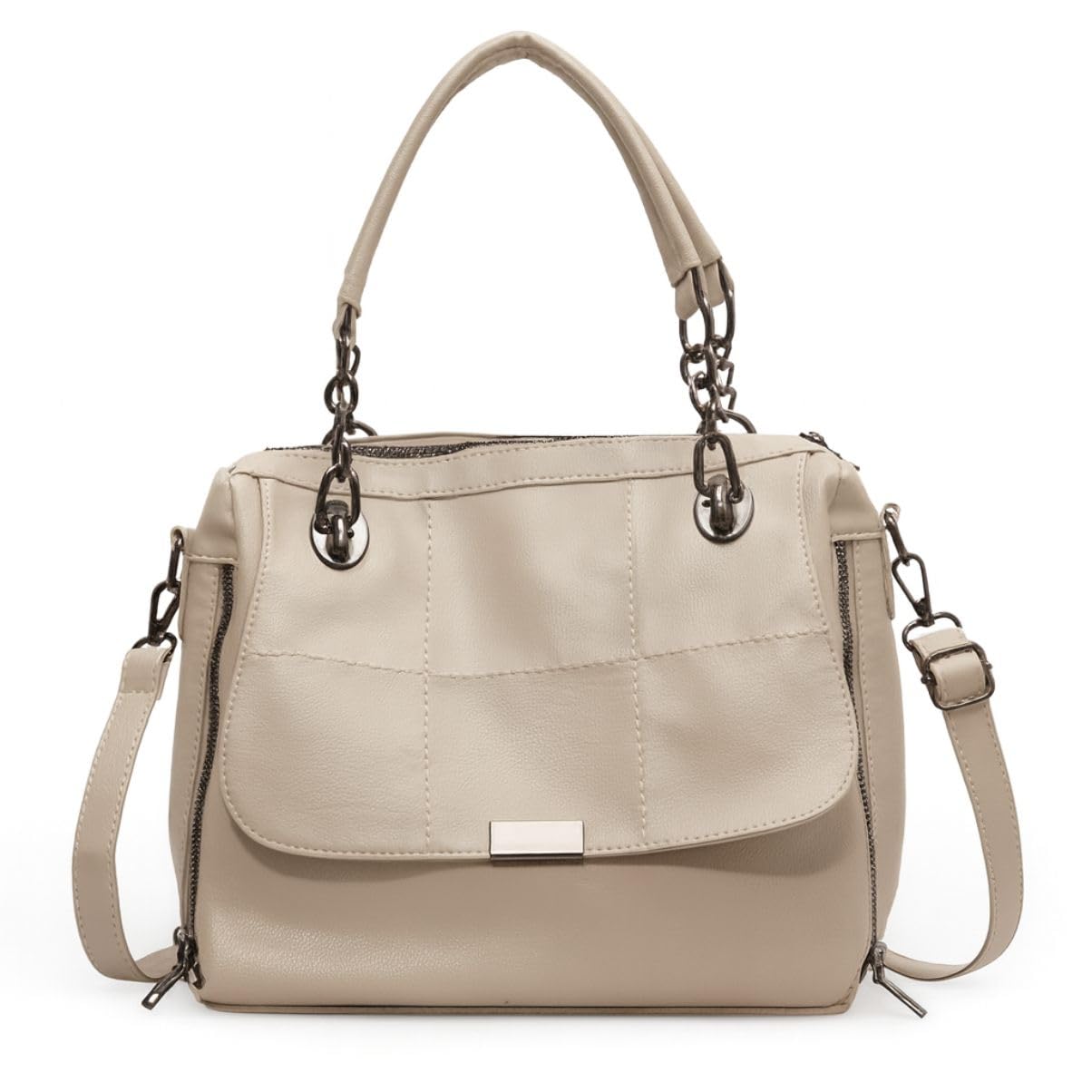 - – Alça de mão com detalhes em corrente metálica. – Alça transversal ajustável e removível para maior praticidade. – Compartimentos: Bolso frontal com tampa, bolsos laterais e amplo espaço interno com fechamento seguro. – Acabamento Premium: Costuras reforçadas e metais de alta resistência.