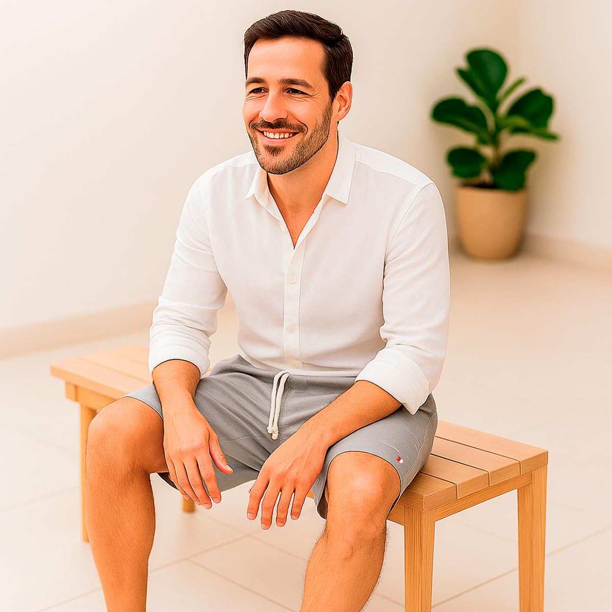 - Bermuda masculina com tecido de linho misto leve e respirável para máximo frescor Modelagem anatômica moderna que garante conforto e caimento perfeito Cós elástico com cordão ajustável para ajuste personalizado e praticidade Bolsos laterais funcionais que unem estilo e utilidade no dia a dia