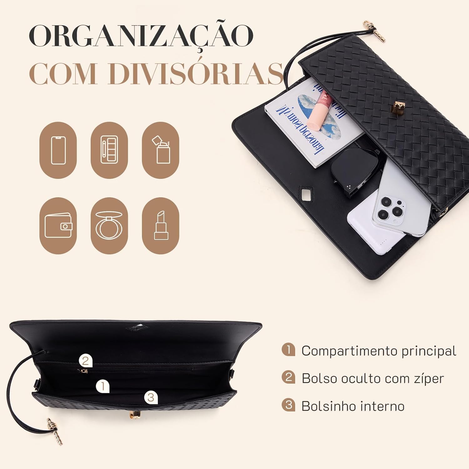 • 3 FORMAS DE USAR: Top handle, clutch noturna ou bolsa transversal. A alça destacável permite transformar o visual rapidamente, sendo perfeita para casamentos, jantares, festas ou compromissos do dia a dia
