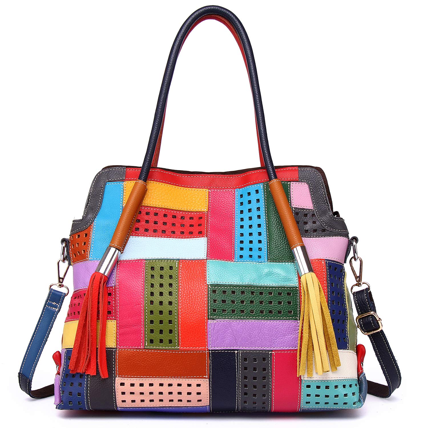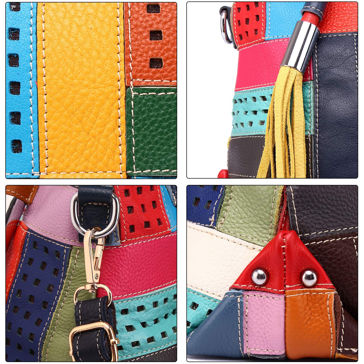- ✿ Material: Bolsa grande 100% couro de vaca genuíno primeira camada. Design exclusivo de padrão colorido com costura oca 3D. Bolsa grande com muito espaço. Alça de ombro longa removível multicolorida, mas elegante.
