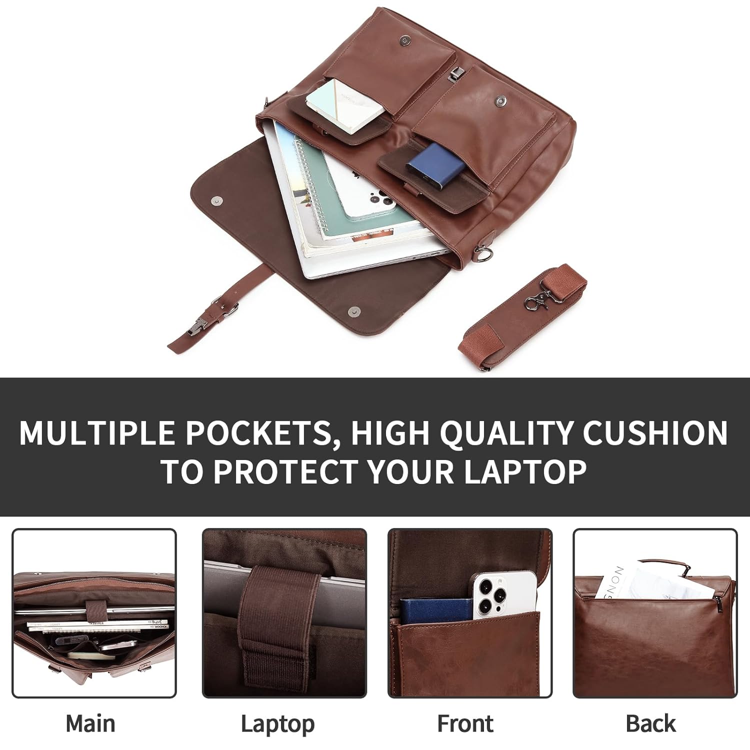 - Vários bolsos espaçosos: a bolsa masculina possui mais de 9 bolsos que podem guardar seus itens essenciais separadamente e manter as coisas organizadas, 1 parte acolchoada para laptop, 1 compartimento principal grande com fecho de zíper principal seguro, 2 bolsos internos, 1 bolso longo com zíper, 2 bolsos médios, 1 bolso externo com zíper diagonal e 1 bolso traseiro com zíper para artigos significativos.