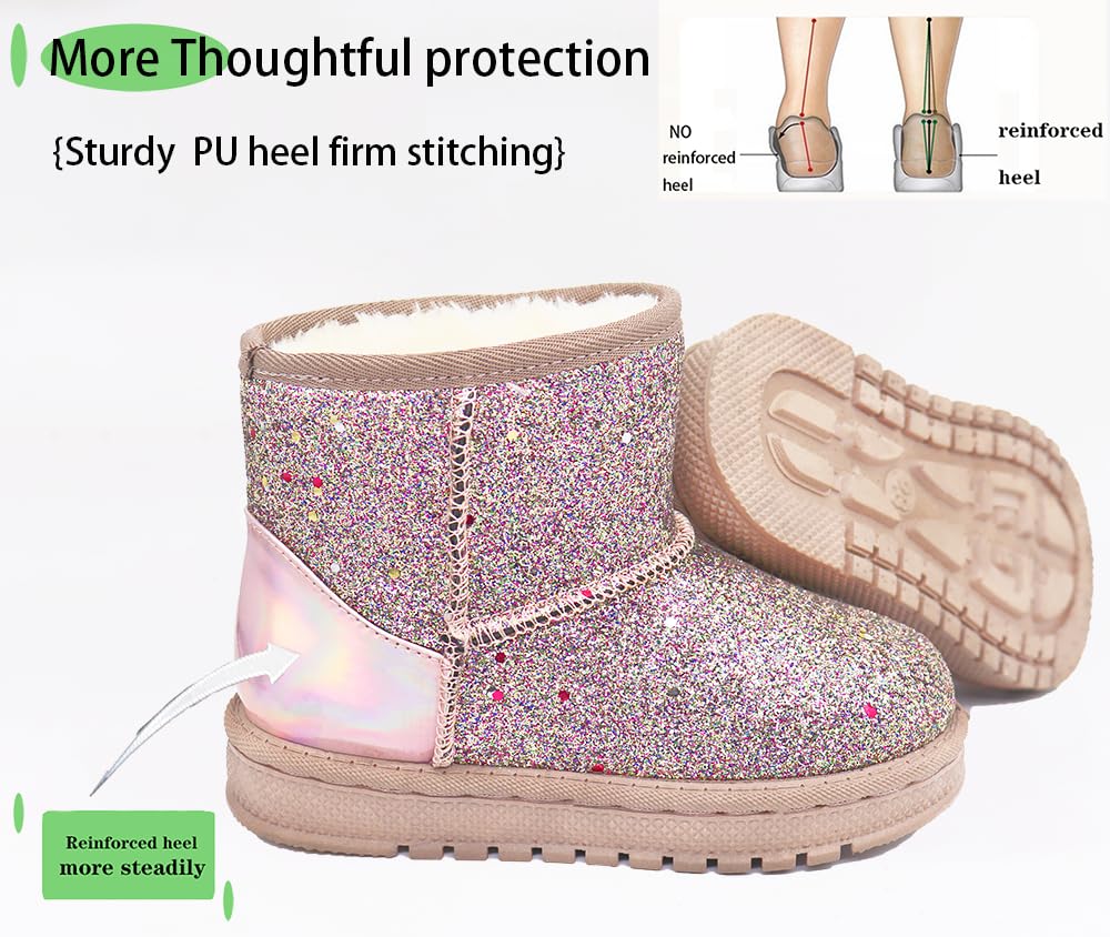 - Botas de glitter para meninas: o design confortável de bico redondo anticolisão cria botas de neve confortáveis e saudáveis. Design íntimo e quente. A boca da bota feminina e a pelúcia são completamente emendadas para envolver os pés do bebê. Fácil de colocar e tirar, para que as crianças não tenham mais medo do frio no inverno.