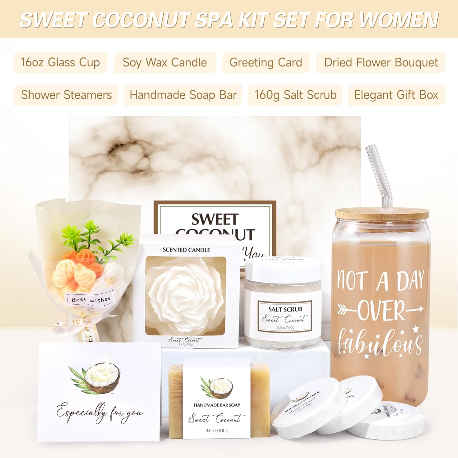 Cestas De Presentes De Spa Para Mulheres, Cestas De Presentes De Aniversário De Coco Doce Para Mulheres, Caixa De Presente De Kit De Spa, Conjunto De Presente Relaxante Para…
