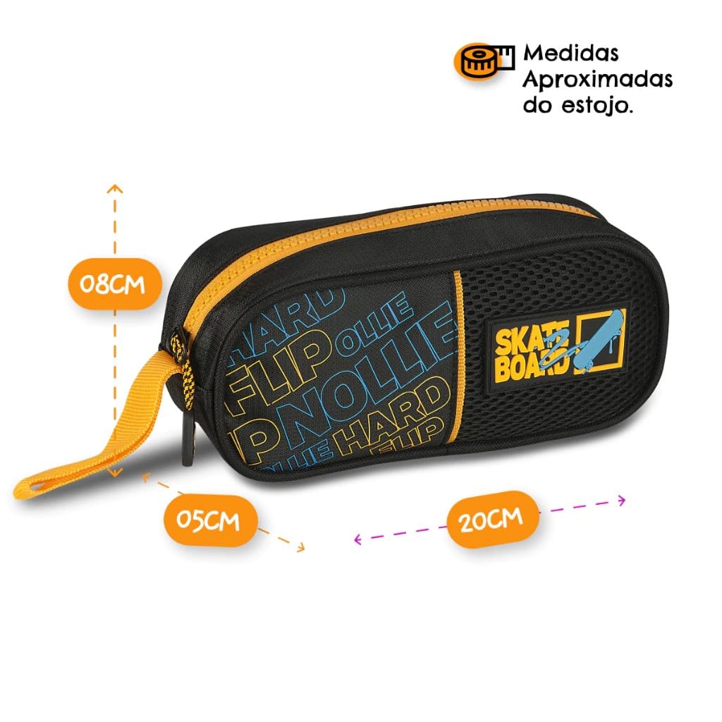 Especificação: Clio Kit Escolar Completo, Mochila de Rodinhas com Skate Board, Lancheira Térmica e Estojo, Preto e Amarelo, Design Juvenil