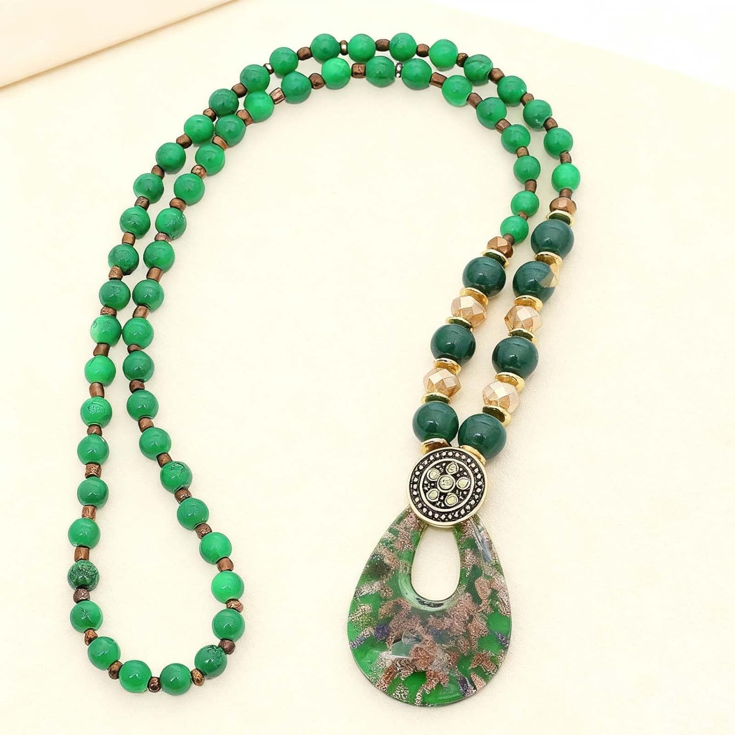 - Contas de qualidade e materiais artísticos do pingente: Feito de contas verdes vibrantes, detalhes de cristal e um pingente de gota de design exclusivo com elementos decorativos embutidos. O colar é projetado para durabilidade e para destacar sua estética artística e artesanal.