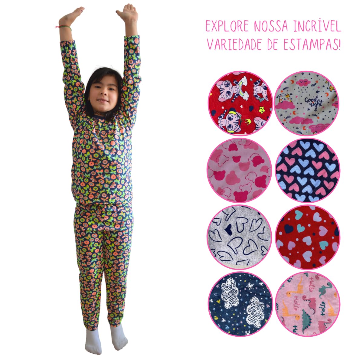 Especificação: Conjunto Feminino Pijama Manga Longa Estampado com Calça Bebê ao Infantil de 1 a 14 anos para Noites Frias Menina