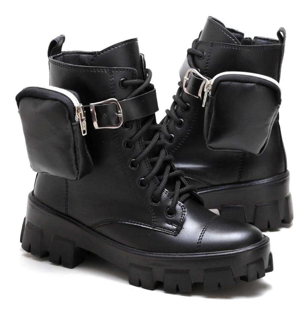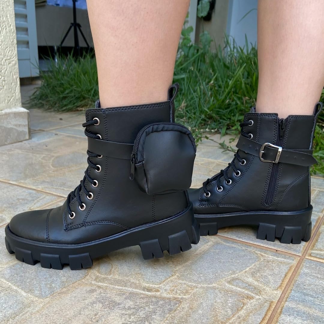 Oferta! Hoje é o melhor dia para comprar Coturno Feminino Cano Alto Tratorado com Bolsinha Lateral Ziper e Cadarco para Inverno Moda Casual Urbana com aquele preço que você procura e ainda com as melhores condições!