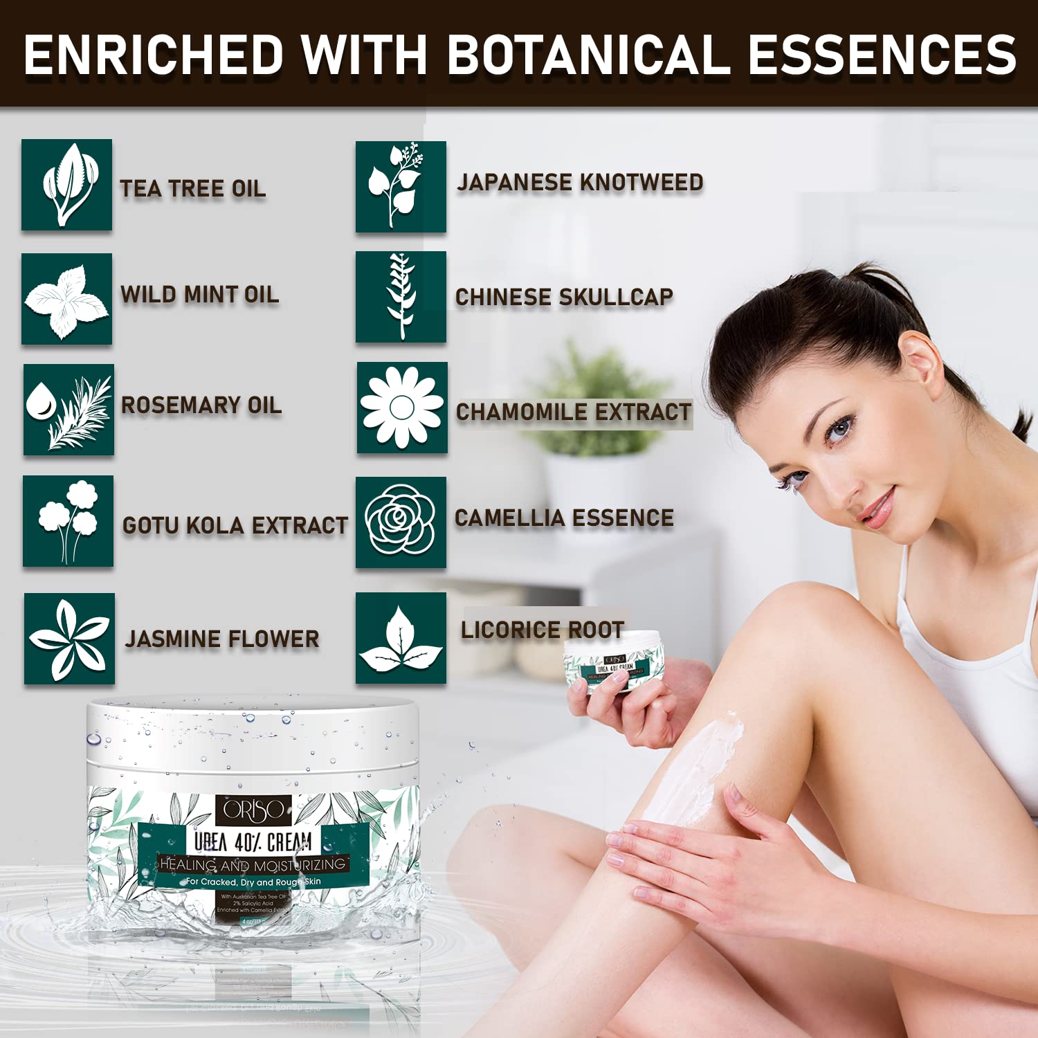 - Com botânicos; este creme de ureia 40% para os pés, fórmula de força máxima é enriquecida com extratos de plantas para maior cura; o creme para pés secos da ORISO contém melaleuca, menta selvagem e essência de jasmim que torna nosso hidratante para mãos e pés com um cheiro incrível