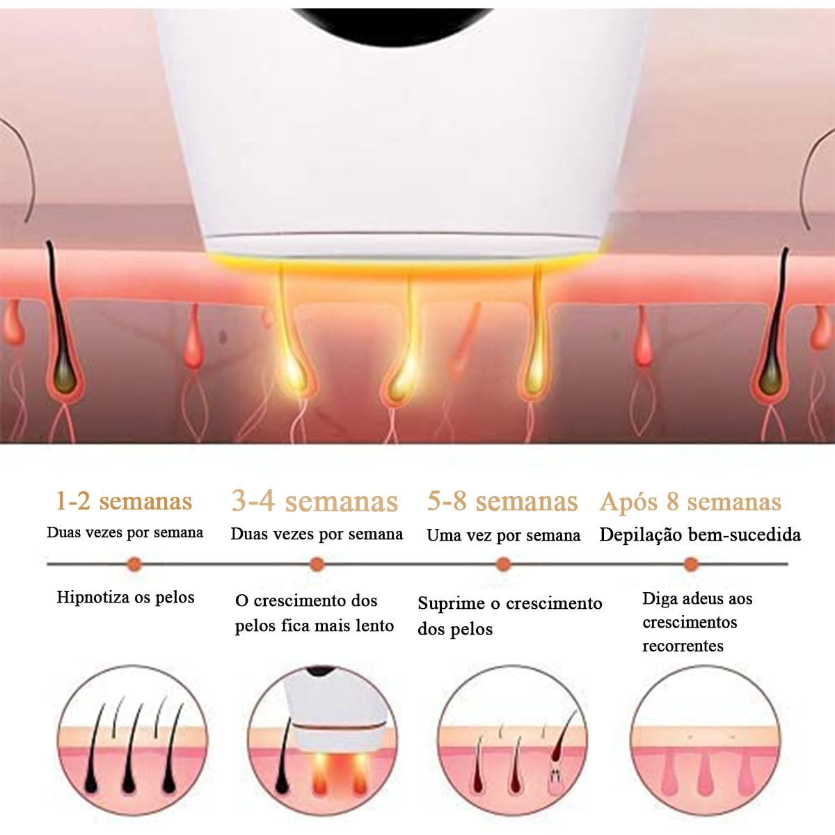 - TECNOLOGIA IPL: Sistema de luz pulsada intensa para depilação permanente, com 900.000 disparos de longa duração para uso em todo o corpo