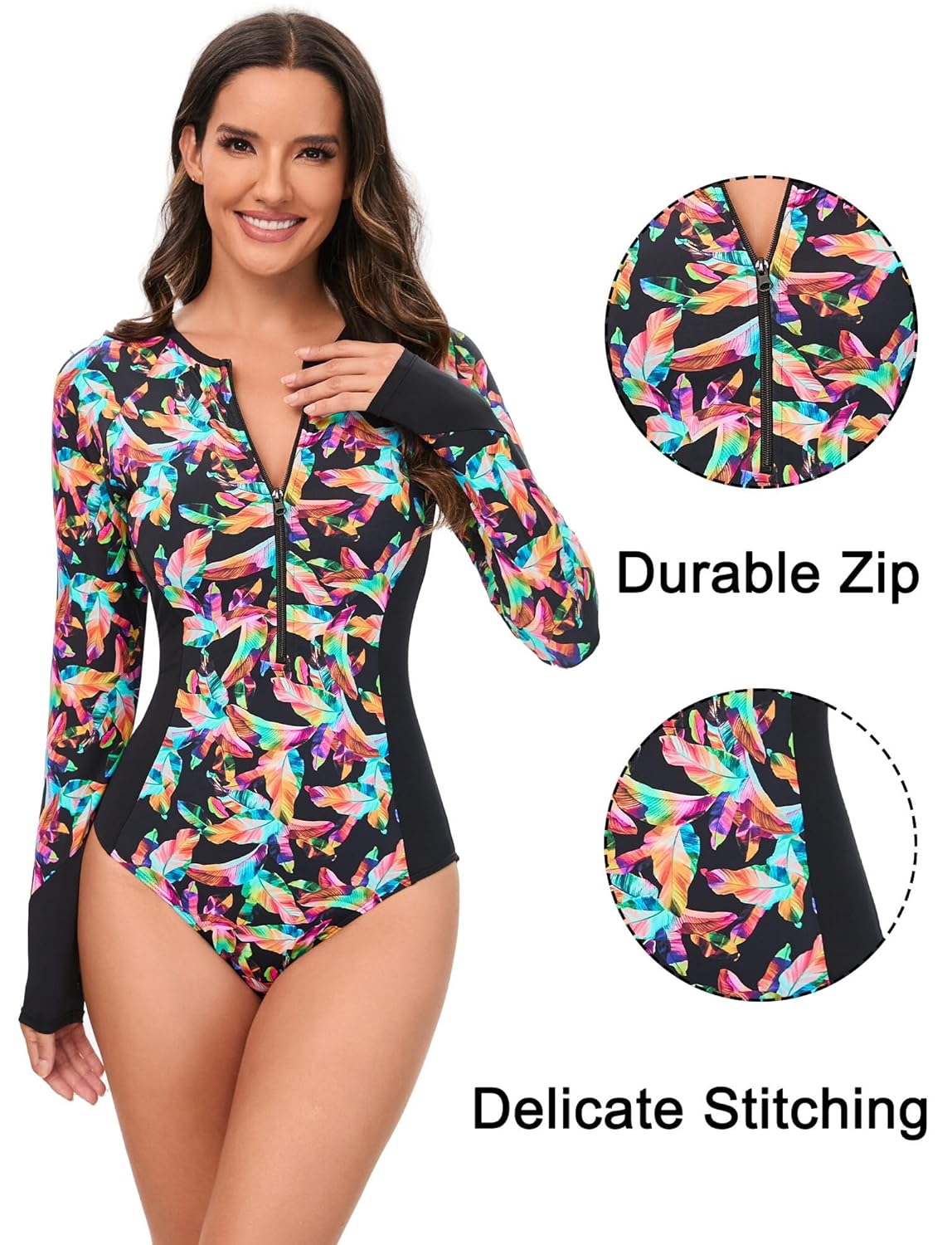 FEOYA Maiô feminino Rash Guard com gola alta manga comprida modesto maiô com zíper e manga surfe
