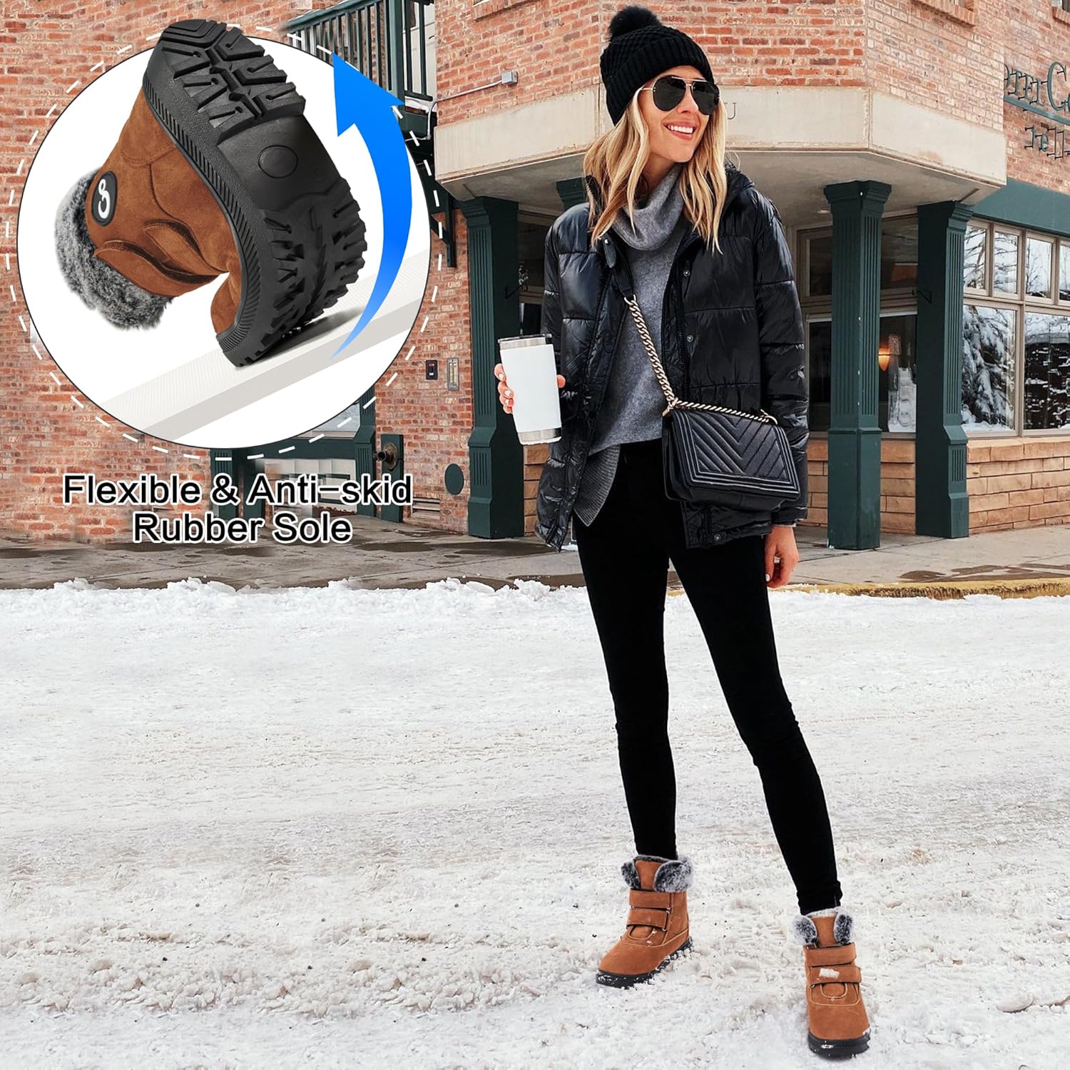 - Forro térmico: as botas de neve femininas apresentam forro macio e confortável de pelúcia e gola de pelúcia, que se ajustam confortavelmente ao redor do tornozelo e envolvem completamente seus pés, protegendo seus pés e tornozelos do frio