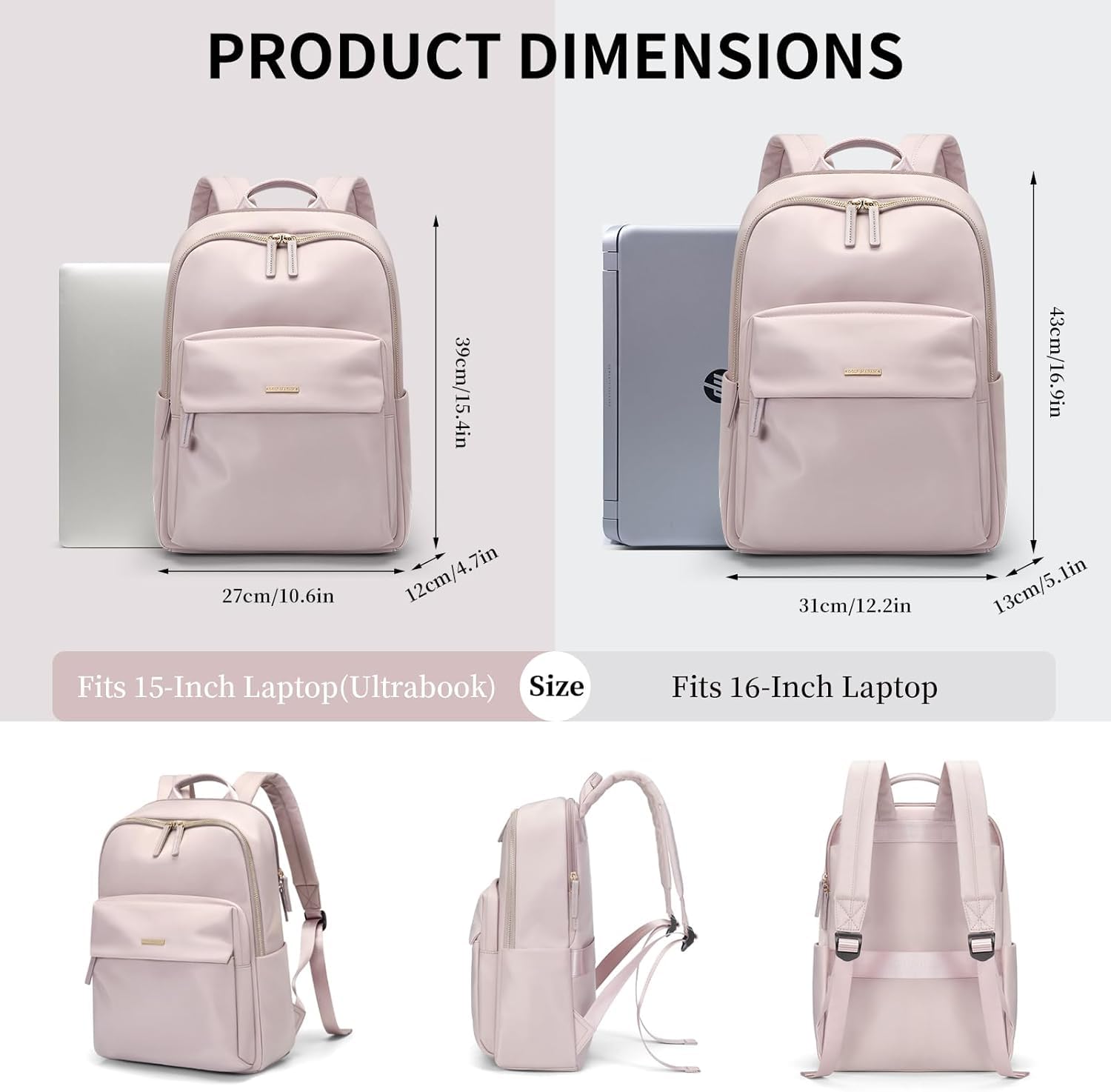 Tamanho e cor: a mochila feminina adota designs elegantes e diferentes opções de cor/tamanho (rosa suave, preto, damasco, cinza claro). Tamanho: 15,75″ x 4,72″ x 10,63″/40 x 12 x 27 cm e 16,93″ x 5,12″ x 12,2″/43 x 13 x 31 cm.