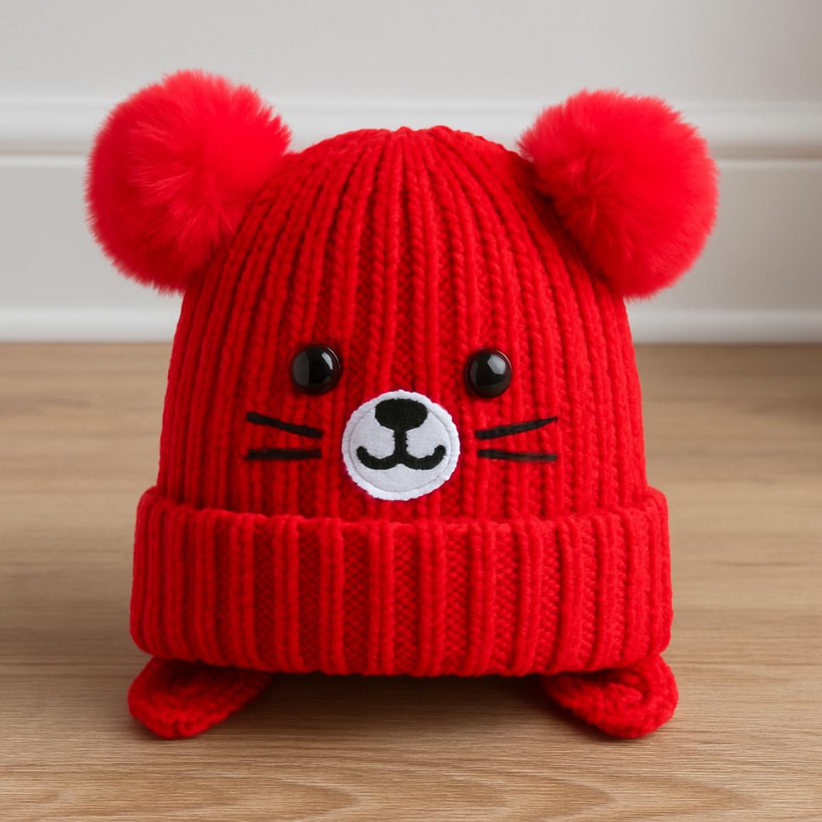 - DESIGN ADORÁVEL: Gorro infantil vermelho com detalhes de urso, incluindo pompons fofos nas orelhas e rostinho bordado com expressão simpática