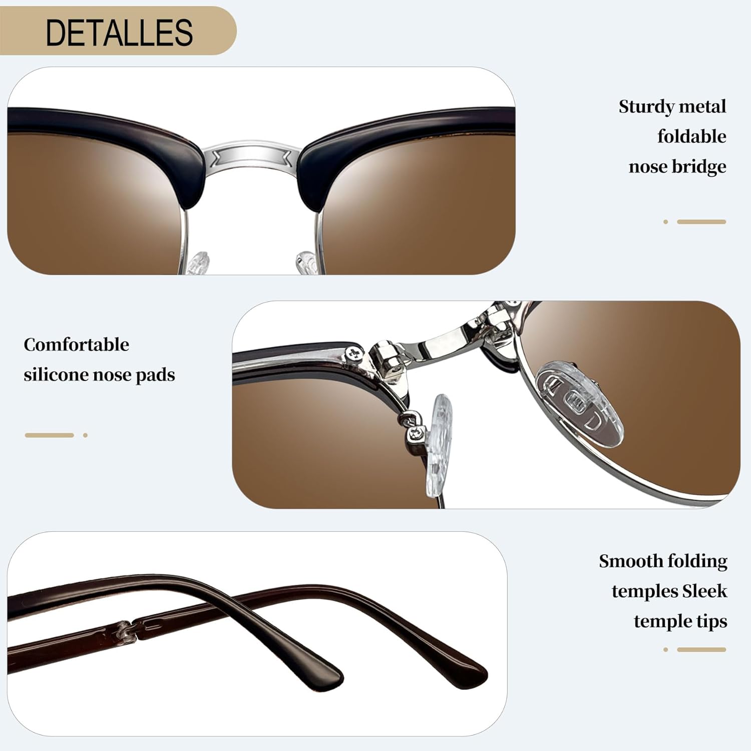 - Conforto e durabilidade: Esses óculos de sol polarizados são feitos de materiais de resina, armação de plástico metálico resistente, porém leve, almofadas de silicone macias para o nariz, dobradiças de metal de dupla abertura e lentes polarizadas superiores