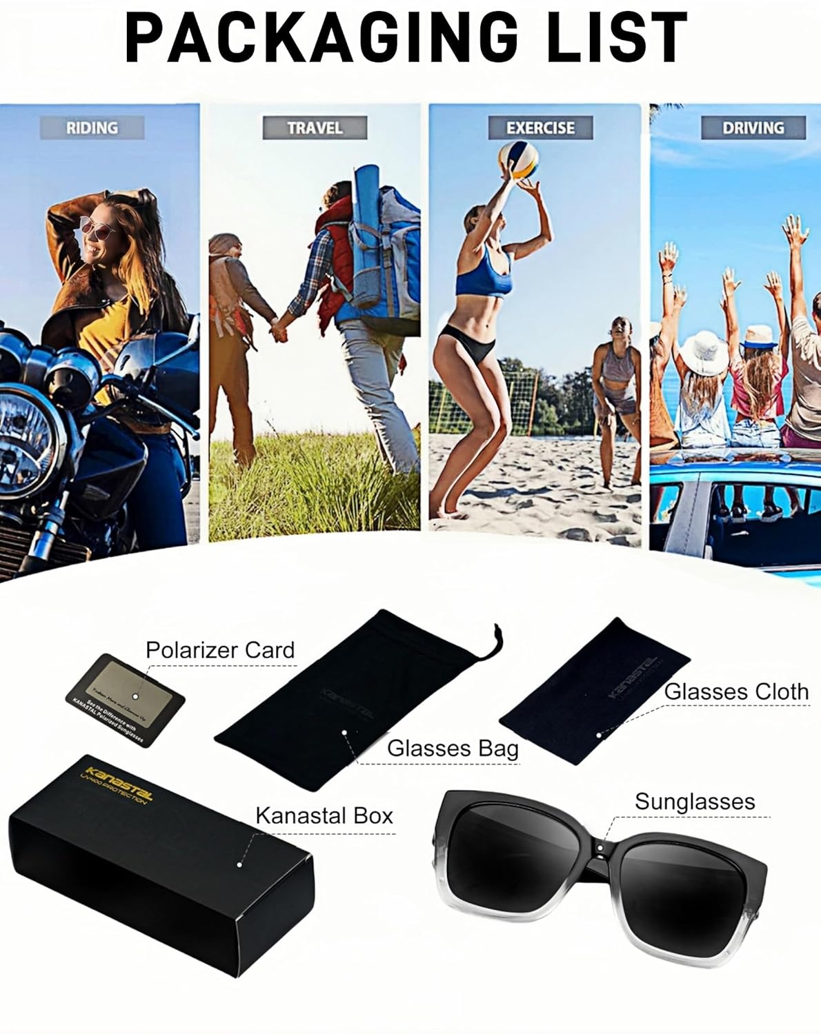 - O pacote inclui: Um óculos de sol polarizado KANASTAL, uma caixa de embalagem, uma bolsa macia, um pano de limpeza e um cartão de teste polarizado. Óculos de sol grande que conferem uma aura de estilo àqueles que usam óculos duplos (óculos + óculos de sol) sem sentir desconforto