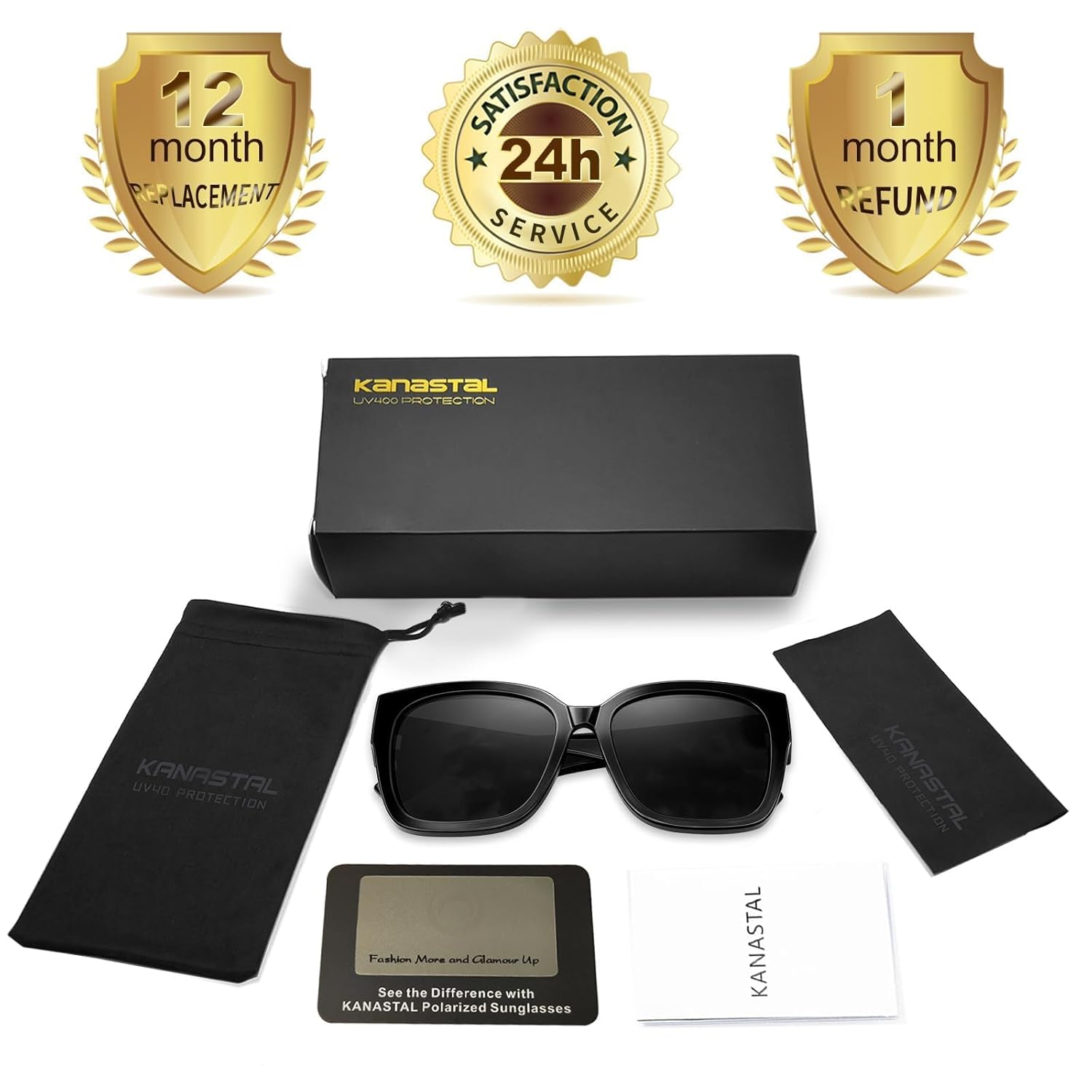 - O pacote inclui: Um óculos de sol polarizado KANASTAL, uma caixa de embalagem, uma bolsa macia, um pano de limpeza e um cartão de teste polarizado. Óculos de sol de tamanho grande que conferem uma aura de estilo àqueles que usam óculos duplos (óculos + óculos de sol) sem sentir desconforto