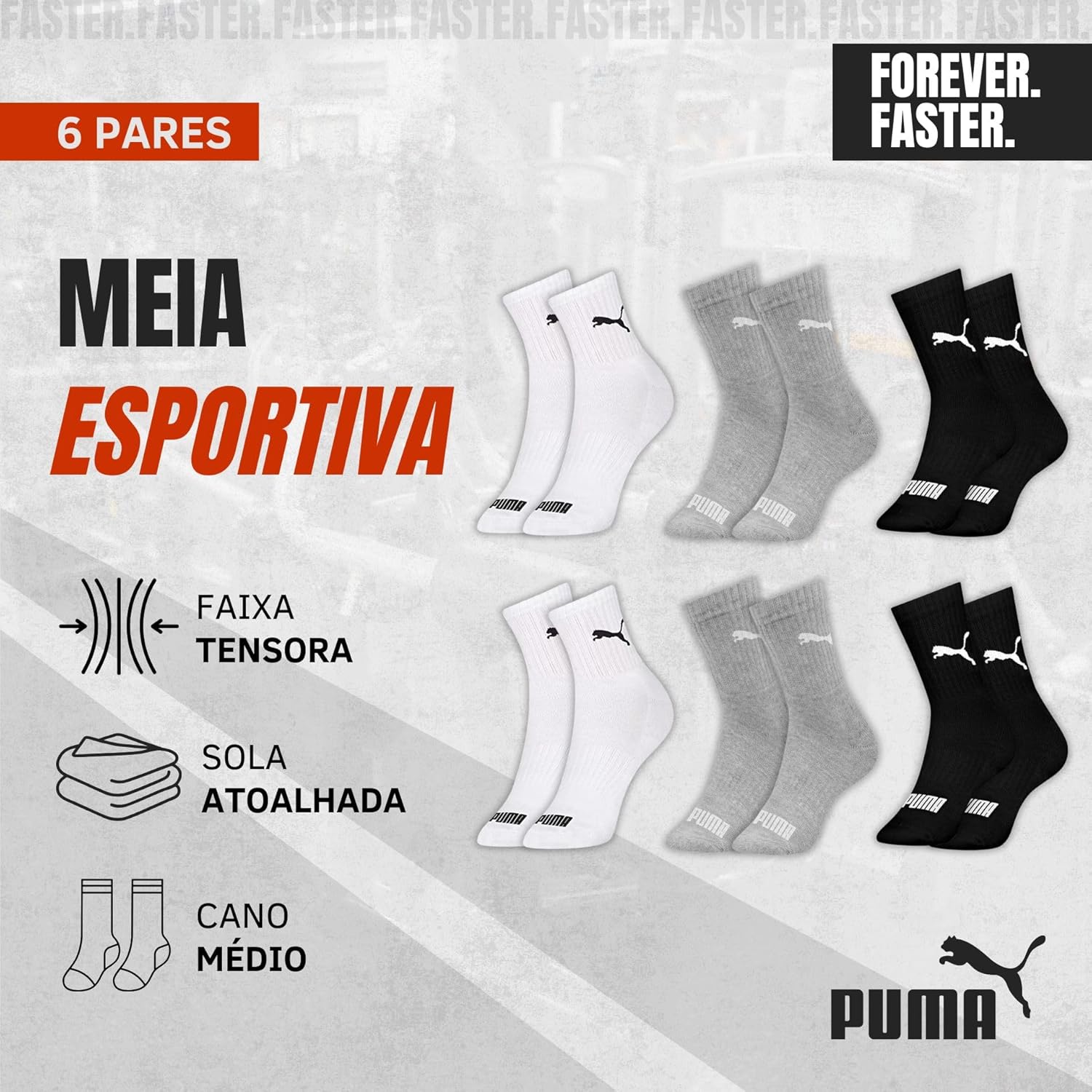 Kit 06 Pares Meia Puma Cano Médio Esportiva Everyday Algodão Adulto Unissex