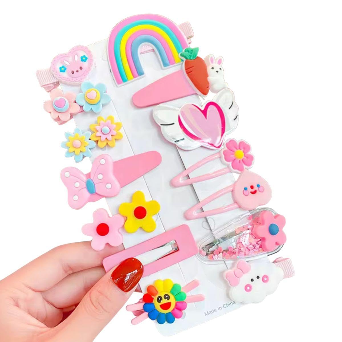 Presilhas de Cabelo Infantil Feminina, Kit com 14 Peças, Tic Tac Bico de Pato, Flores, Arco-íris, Frutas, Borboletas, Cores Sortidas