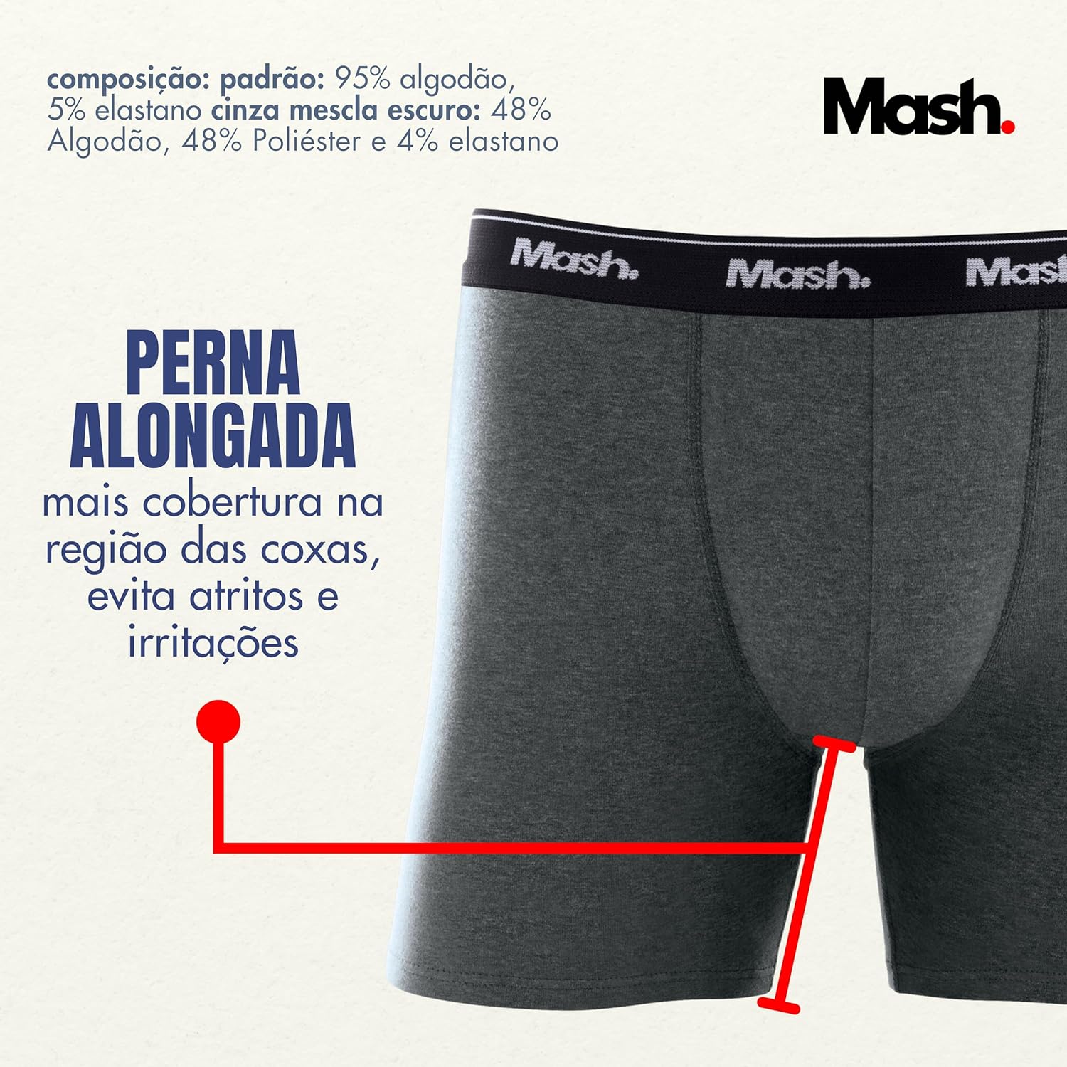 - Boxer Alongada: Com um comprimento adicional em comparação com uma boxer tradicional, ela é mais longa e evita atritos entre a pele, prevenindo assaduras e incômodos.