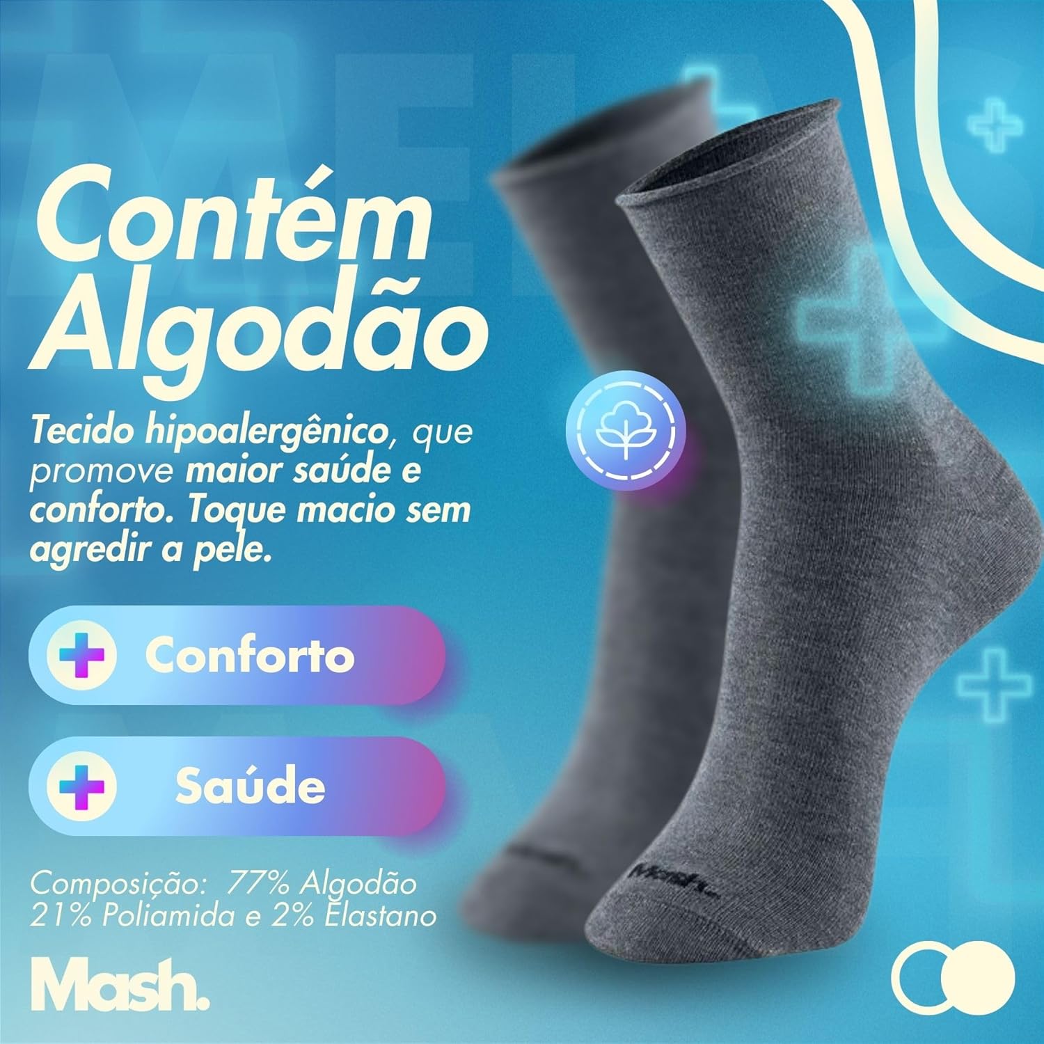 - Design Cano Médio: A meia apresenta cores neutras para uso casual e possui o logo “Mash” próximo às ponteiras, sendo uma ótima opção para ter vários pares para cuidar da saúde dos pés com tranquilidade e bem-estar.