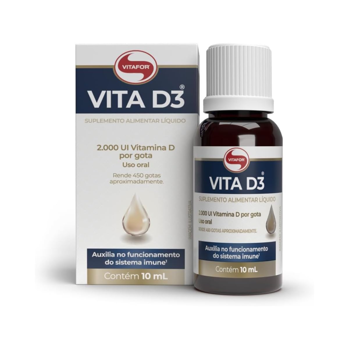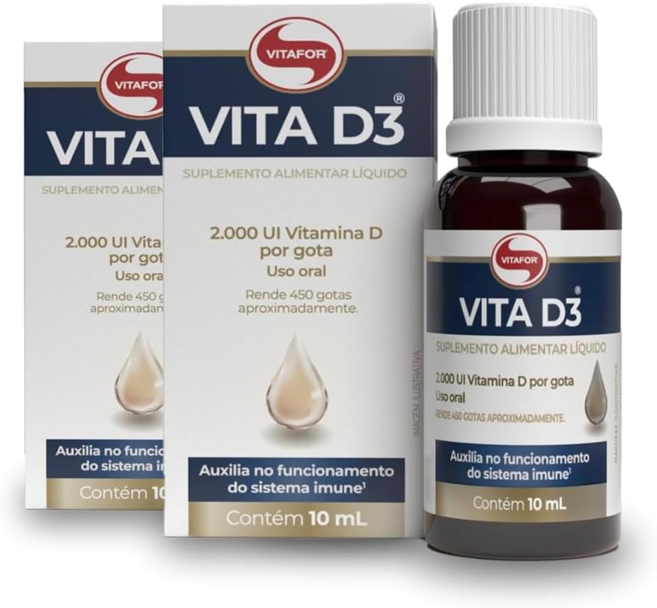 - Vitamina D em Gotas Vitafor 10ml é uma forma simples e prática de garantir excelentes níveis de Vitamina D3 (colecalciferol), que é fundamental para a formação de ossos e dentes, a absorção de cálcio e fósforo, o funcionamento dos sistemas imune e muscular e o processo de divisão celular. Vitamina D em Gotas Vitafor 10ml possui alta concentração de vitamina D3 – 2000 UI de vitamina D3 por gota. Com TCM (triglicerídeos de cadeia média); rende 450 gotas aproximadamente; zero a�