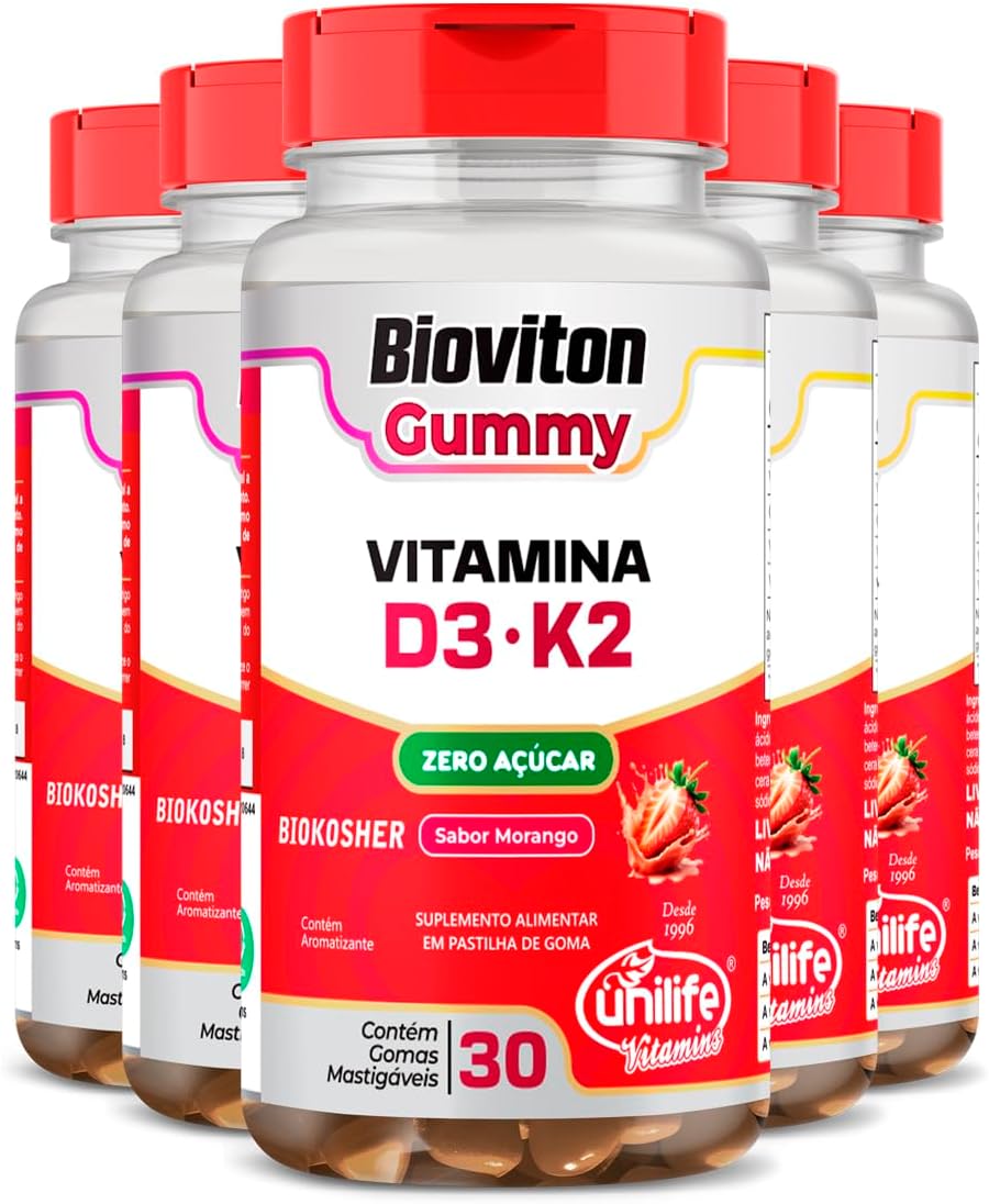 - Kit 5 Gummy Vitamina D3 + K2 Morango Unilife 30 gomas
