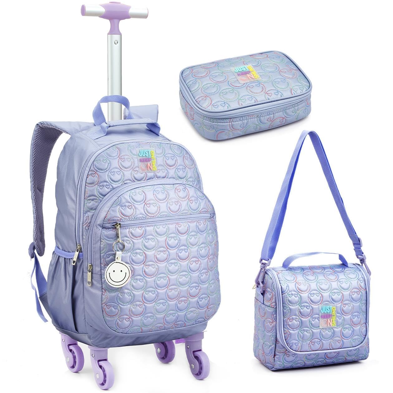 Especificação: Kit Escolar Juvenil 3 Peças, Mochila de Rodinhas, Lancheira Térmica e Estojo com Estampa Estilosa, Infantil para Meninas