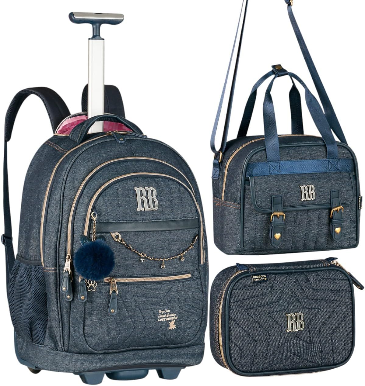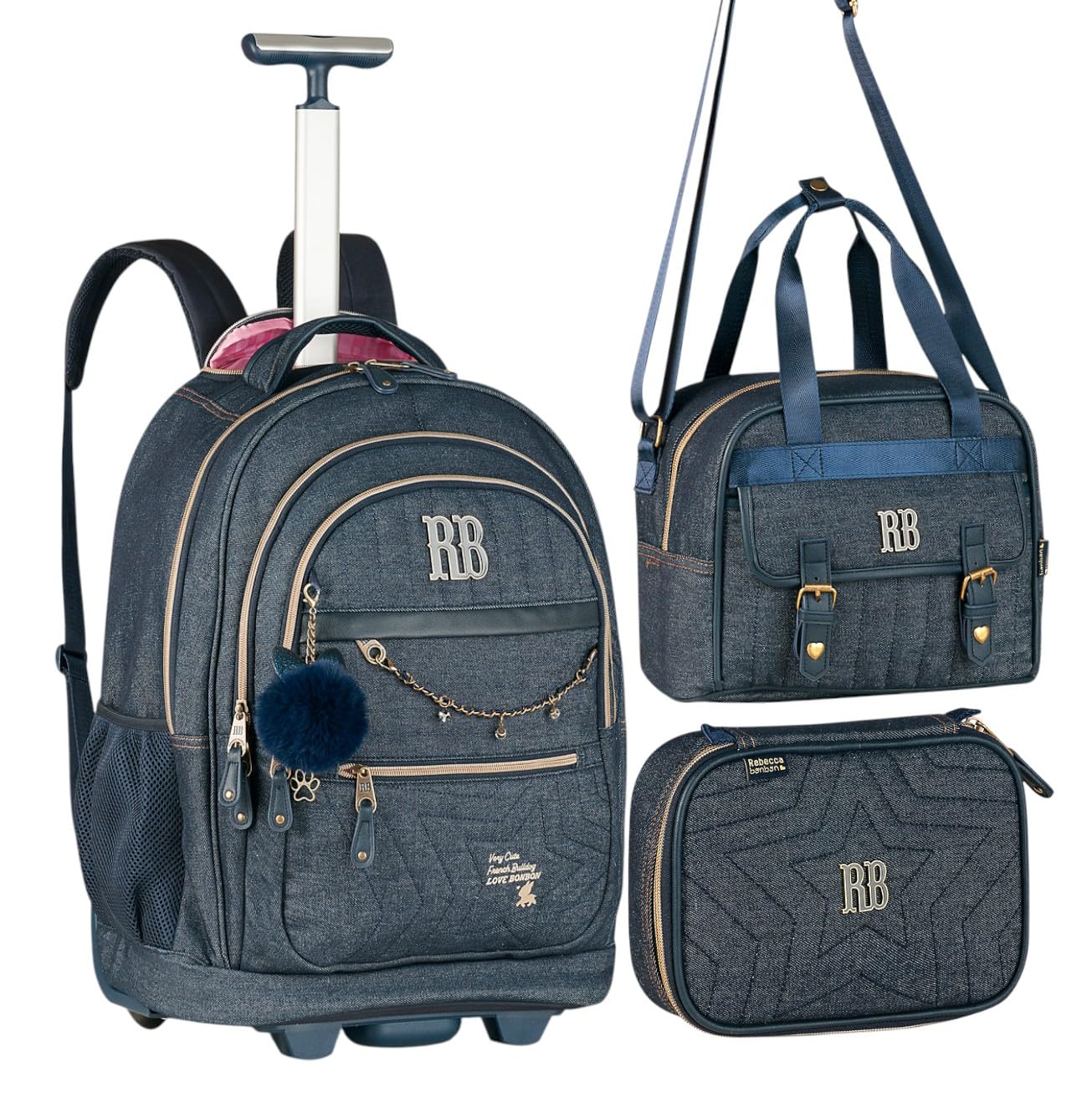 - KIT COMPLETO: Conjunto escolar Rebecca Bonbon com mochila com rodinha, lancheira e estojo, em design jeans vintage elegante e prático