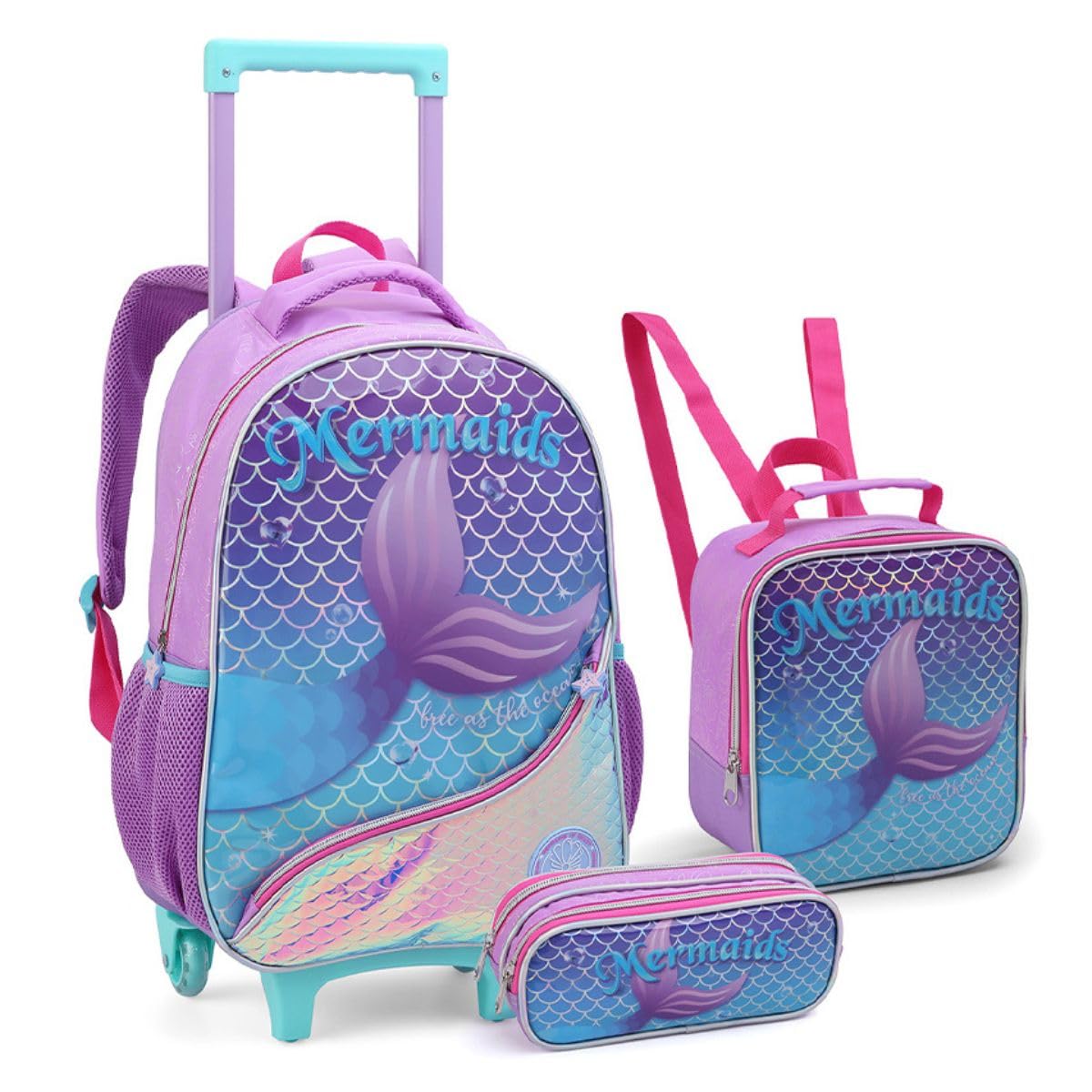 Kit Mochila Escolar com Rodas, Lancheira E Estojo Estampa Sereia, Lilás e Turquesa