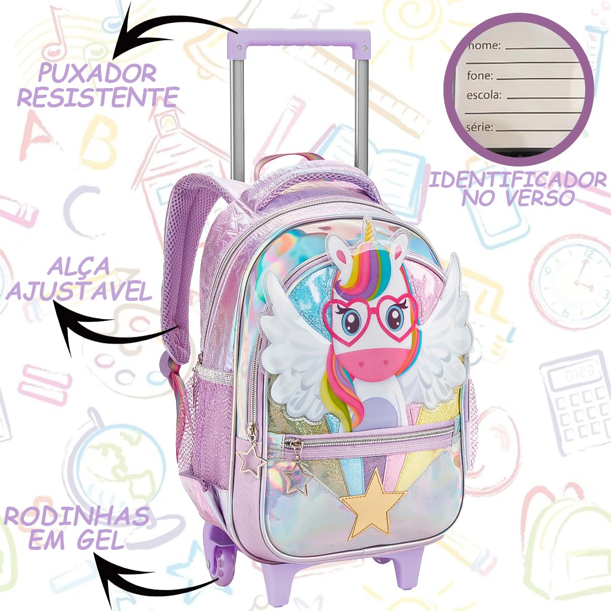 - [Design Encantador + Kit Completo 3 em 1] 🎀 Escolha entre as estampas Sereia, Unicórnio ou Fada! O kit acompanha mochila com rodinhas, lancheira térmica e estojo, trazendo praticidade e charme para a rotina escolar das meninas.