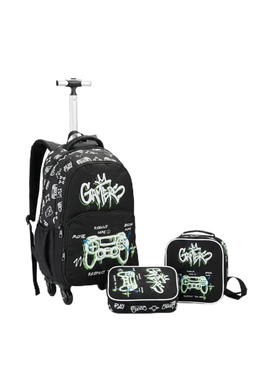 Oferta! Hoje é o melhor dia para comprar Kit Mochila Escolar Juvenil Gamer com Rodas 360°,3 Peças, Estampa Graffiti, Preto e Verde, Para Meninos com aquele preço que você procura e ainda com as melhores condições!