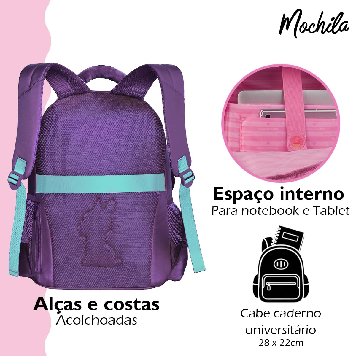 Especificação: Kit Mochila Escolar Rebecca Bonbon RB 27015 Roxa com Lancheira, Estojo box e Garrafinha coleção 2026