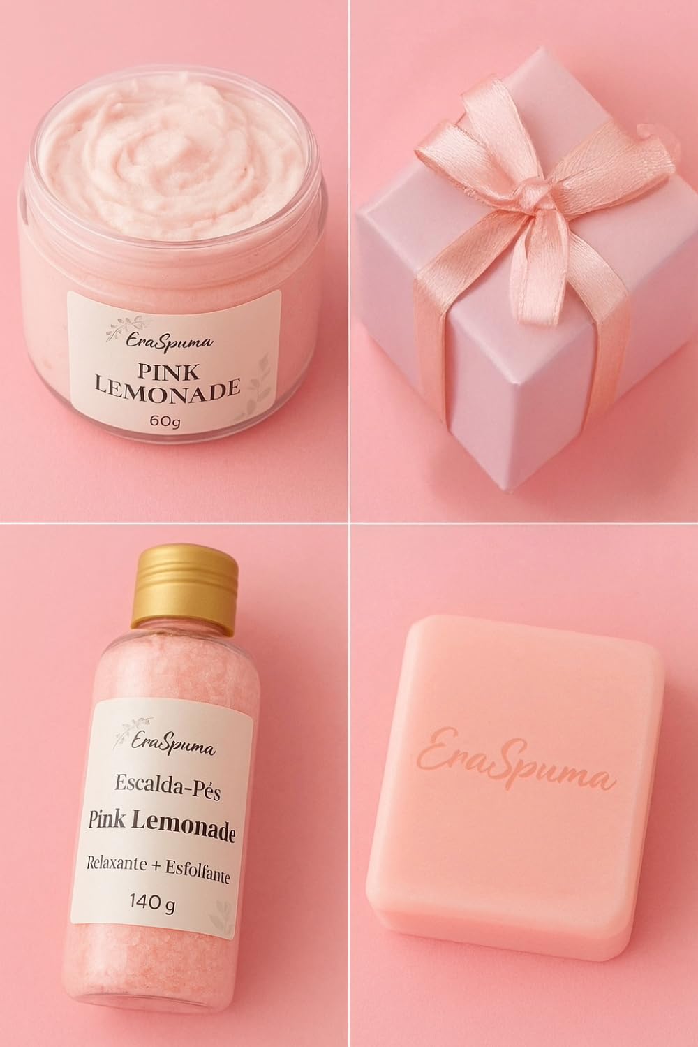 - KIT COMPLETO: Conjunto de produtos Pink Lemonade apresentado em uma elegante caixa kraft decorada com laço rosa