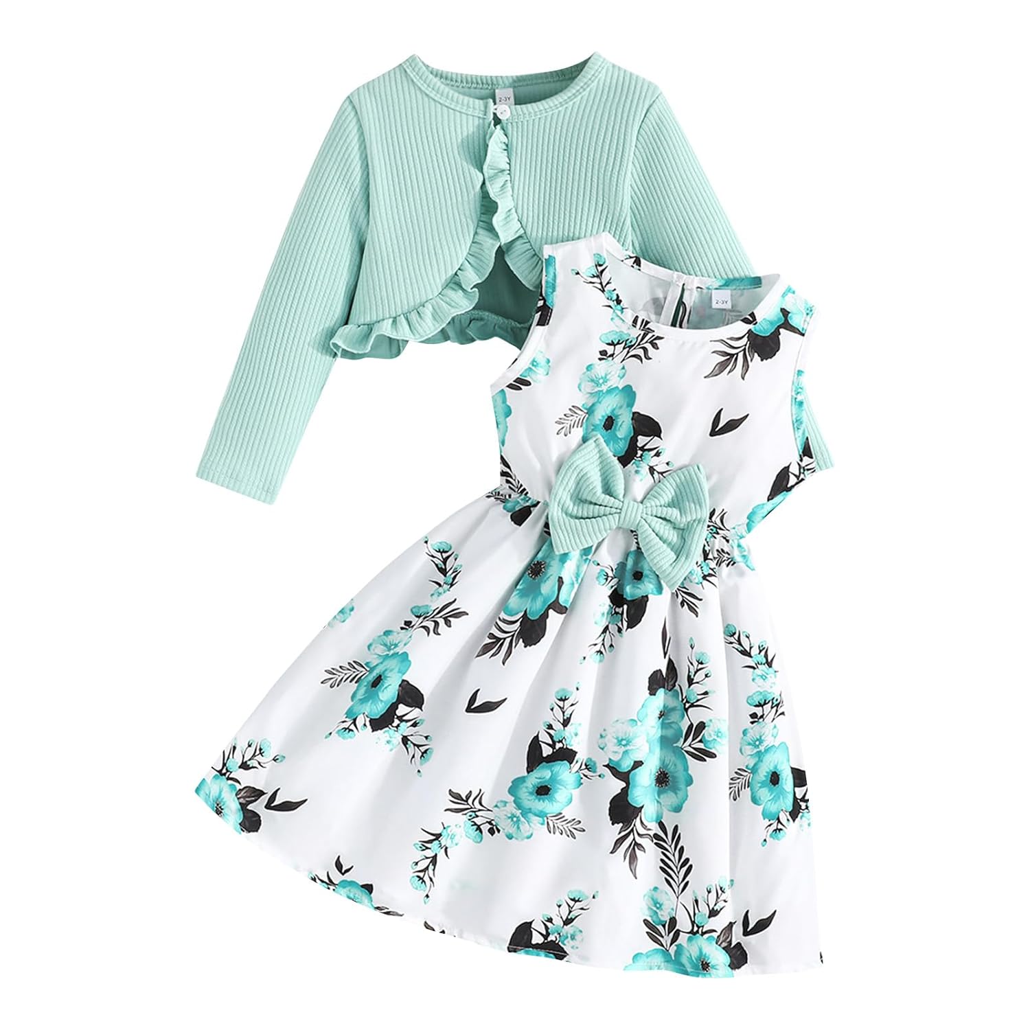 - Lindo design: o vestido sem mangas da menina tem muitas estampas florais e é enfeitado com um laço no centro. Cardigã de cor lisa com acabamento de babados e fecho de botão único para calçar e tirar com facilidade. Pode ser usado sozinho ou combinado, muitas maneiras de combiná-los. O que torna a criança mais doce e elegante.