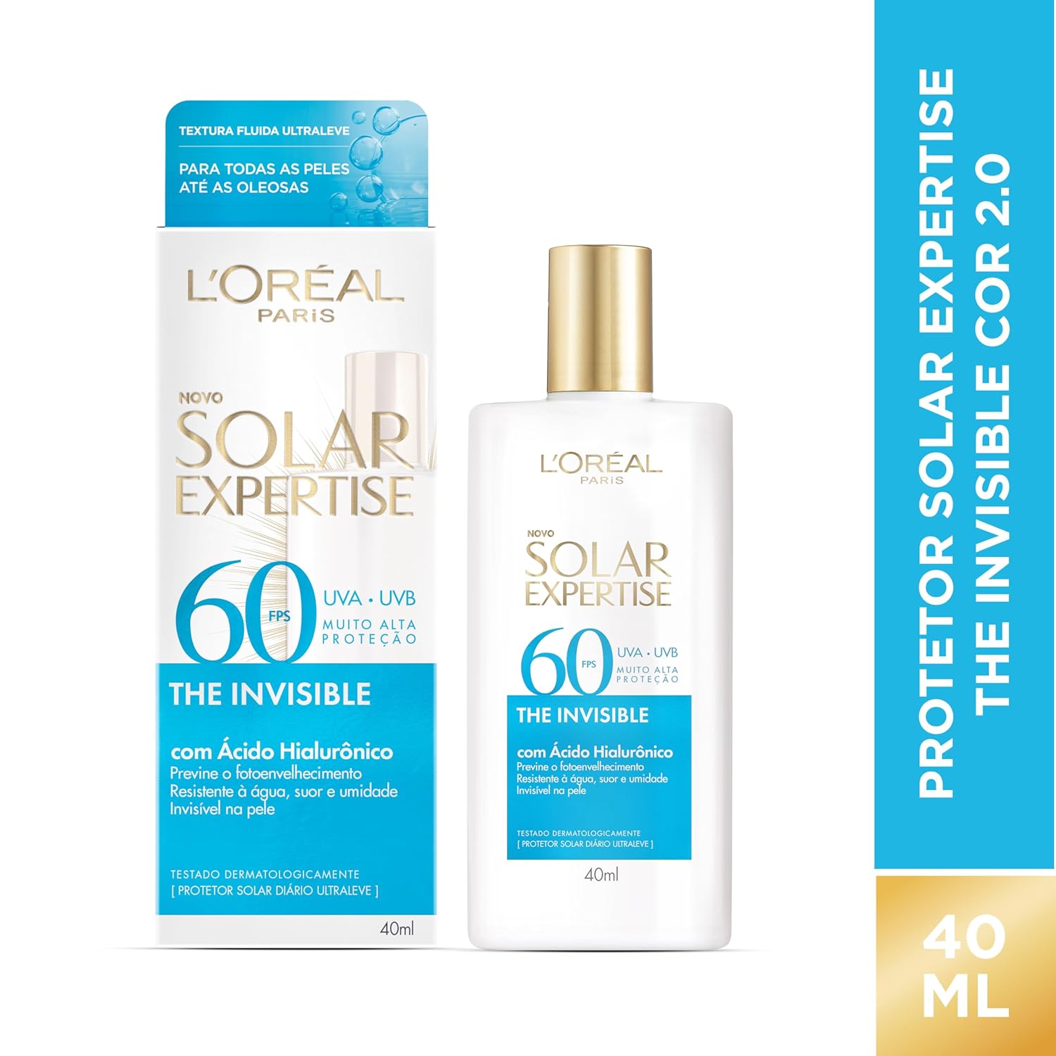 - Contém: 1 Protetor Solar Facial L’Oréal Paris Solar Expertise The Invisible Fluido Sem Cor FPS60 40g, para uma pele saudável, protegida e jovial por mais tempo.