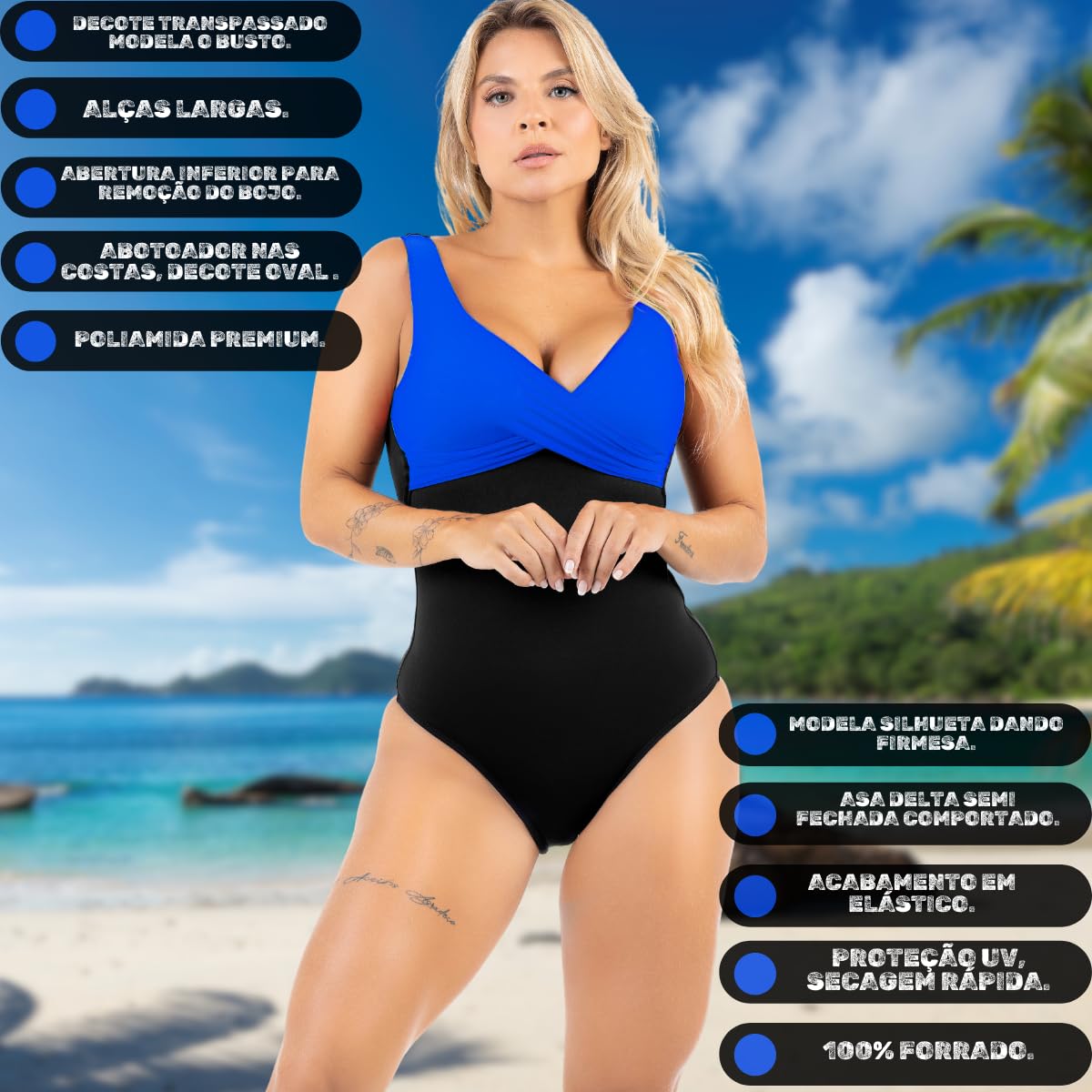 - Modelagem Afina Silhueta: Maiô feminino modelado para afinar a silhueta e realçar as curvas.