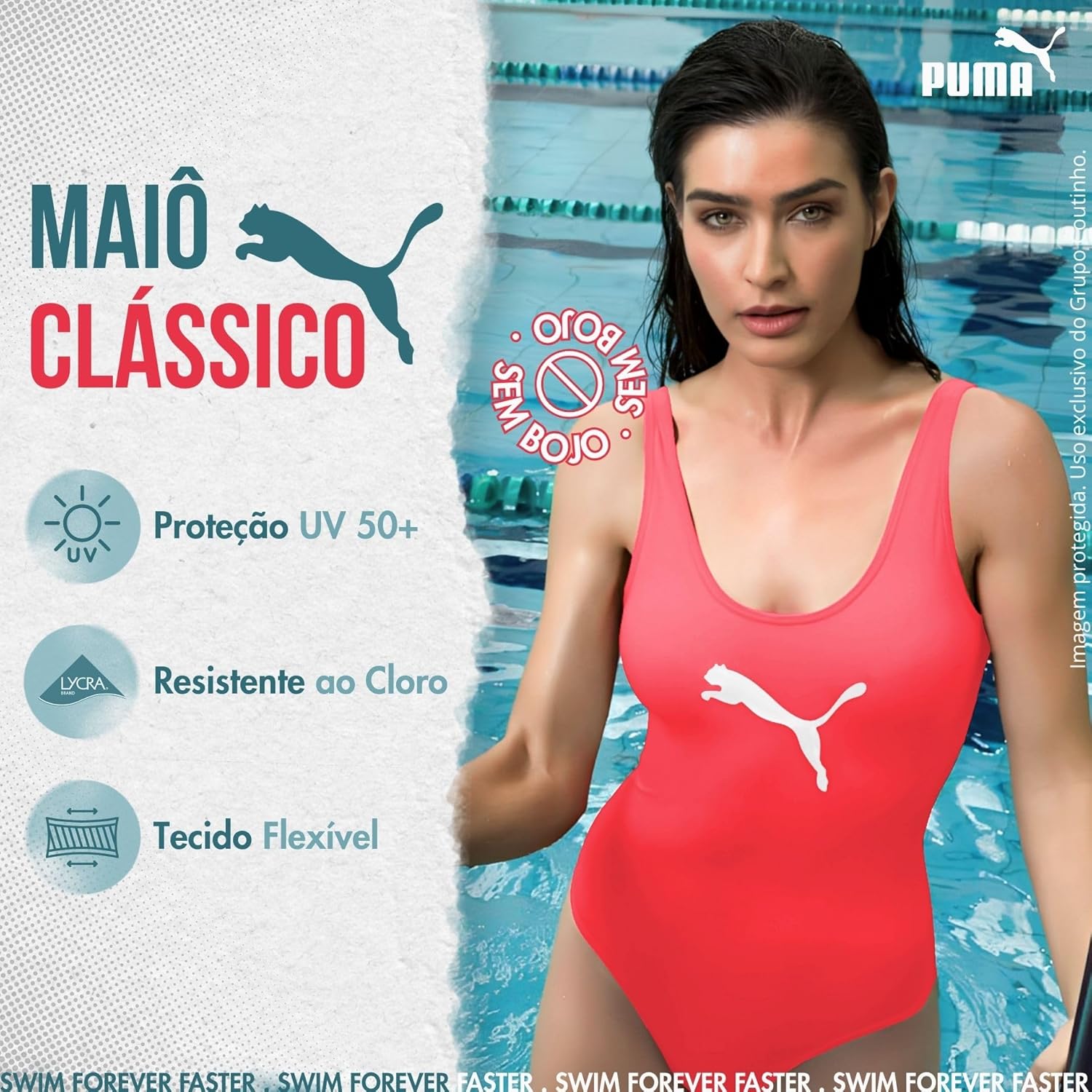 - Tecnologia LYCRA Xtra Life: Confere 10 vezes mais resistência ao cloro ou à água salgada do mar, sem desbotar o tecido e sem agredir a pele.