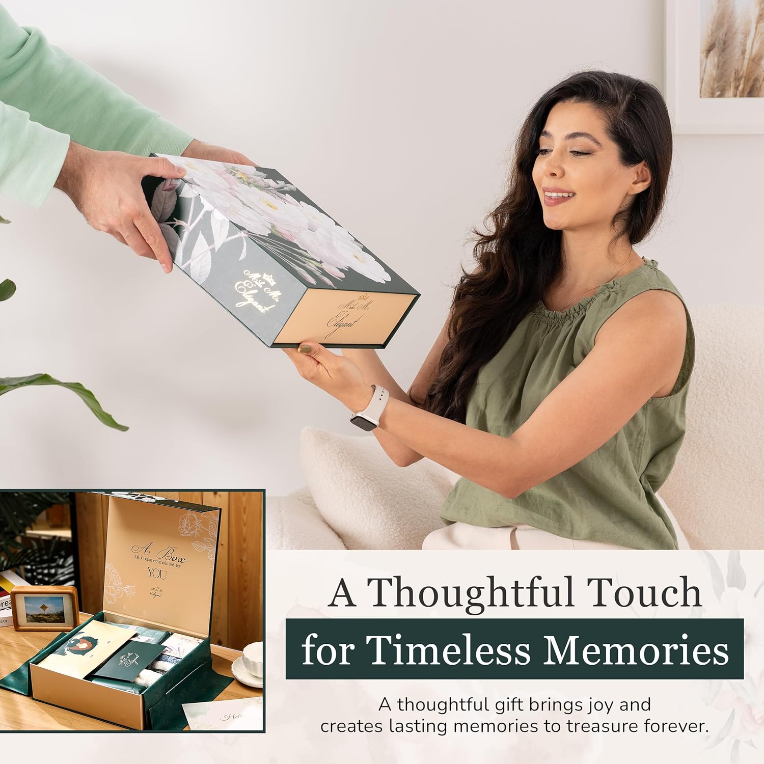- Esta caixa de presente de alta qualidade para mulheres, “Make Me Elegant”, incorpora elegância sem esforço, apresentando uma sinfonia de tesouros ideal para qualquer momento especial, de aniversários a surpresas sinceras. Deixa uma impressão duradoura com seu luxo sem costura, não exigindo nenhum esforço extra para fazê-la se sentir extraordinária. Presente de aniversário para mulheres oferecendo um presente polido e atencioso que permanece como o ápice do presente, garantindo que ela fique encantada com um token sofisticado