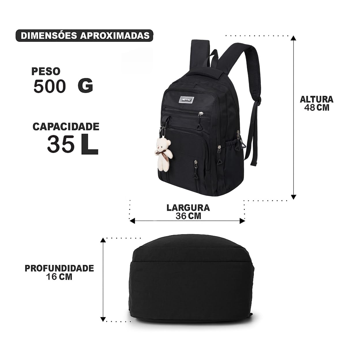 - Mochila multifuncional para personalizar, você pode usar chaveiros, botões e adesivos para deixá-la da maneira que desejar e com muito estilo.