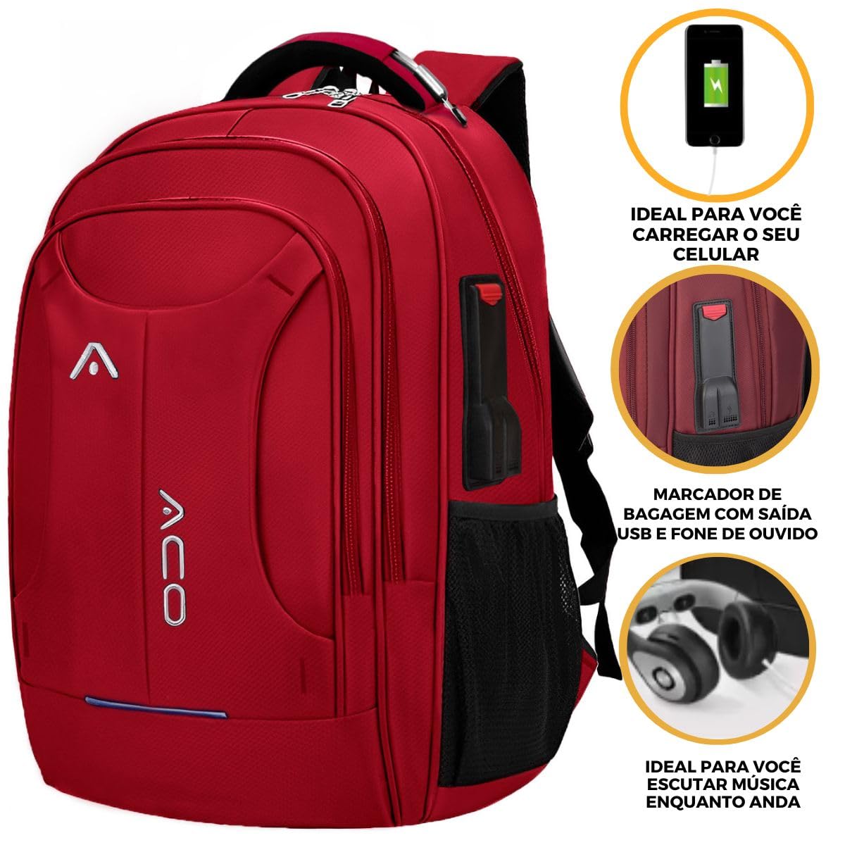 - SAÍDA USB E FONE DE OUVIDO LATERAL (POWER BANK NÃO INCLUSO) E MARCADOR DE BAGAGEM ✅