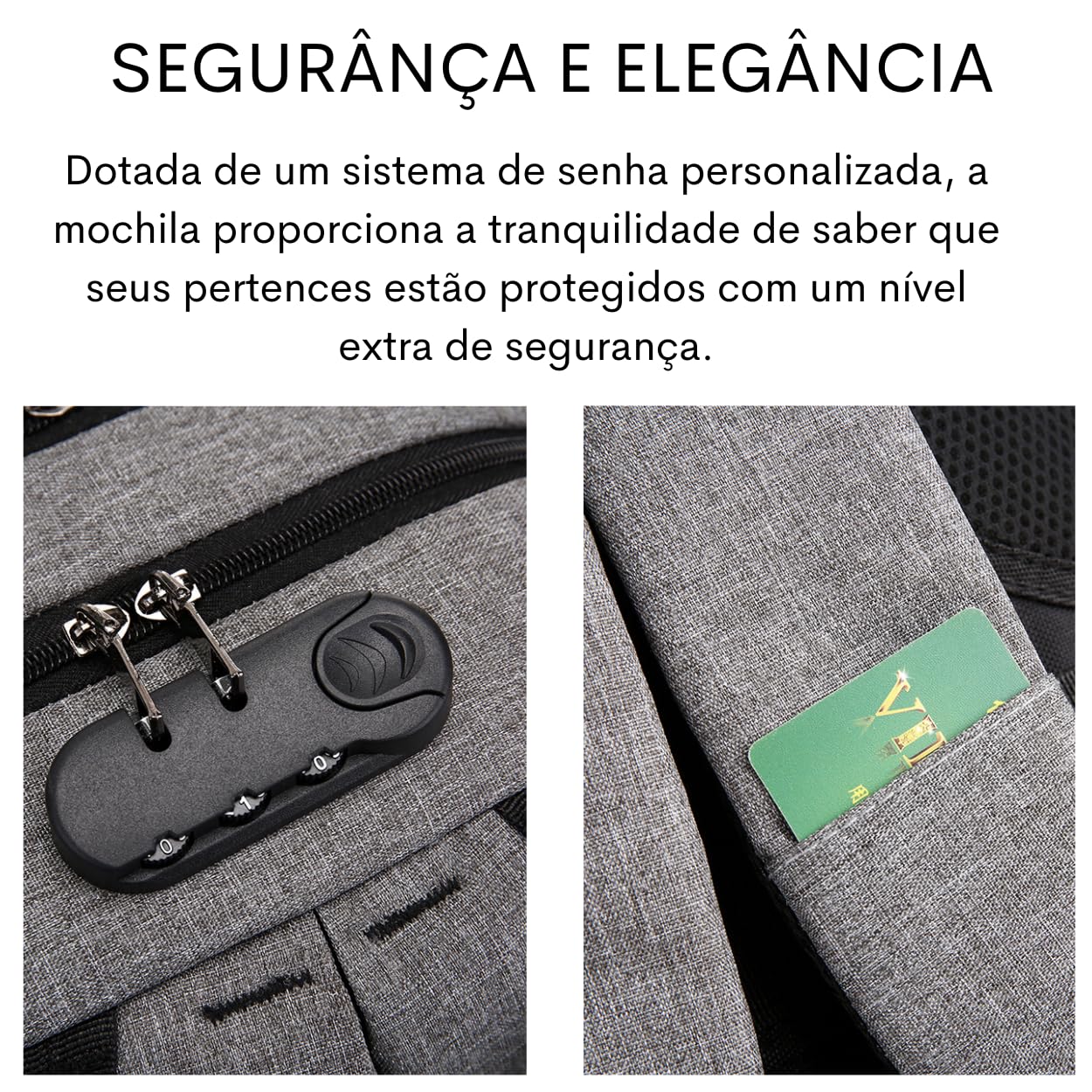 - Segurança e Elegância Unidas Dotada de um sistema de senha personalizada, a mochila proporciona a tranquilidade de saber que seus pertences estão protegidos com um nível extra de segurança.