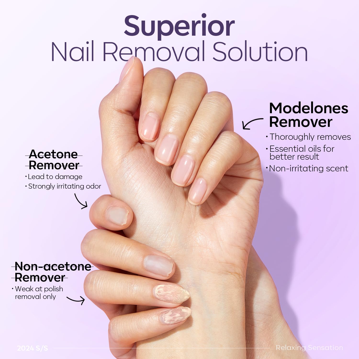 - Calmante e suave: infundido com óleos essenciais de lavanda e rosa, o removedor de cola de unhas modelones suaviza enquanto remove o esmalte. A fórmula suave minimiza a irritação, tornando-a perfeita para unhas e pele sensíveis, deixando as unhas fortes e suaves