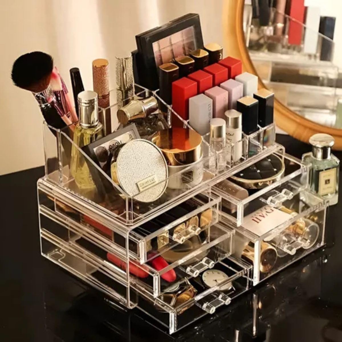 - DESIGN ELEGANTE: Organizador de maquiagem em acrílico transparente com 4 gavetas deslizantes e compartimentos superiores para fácil visualização
