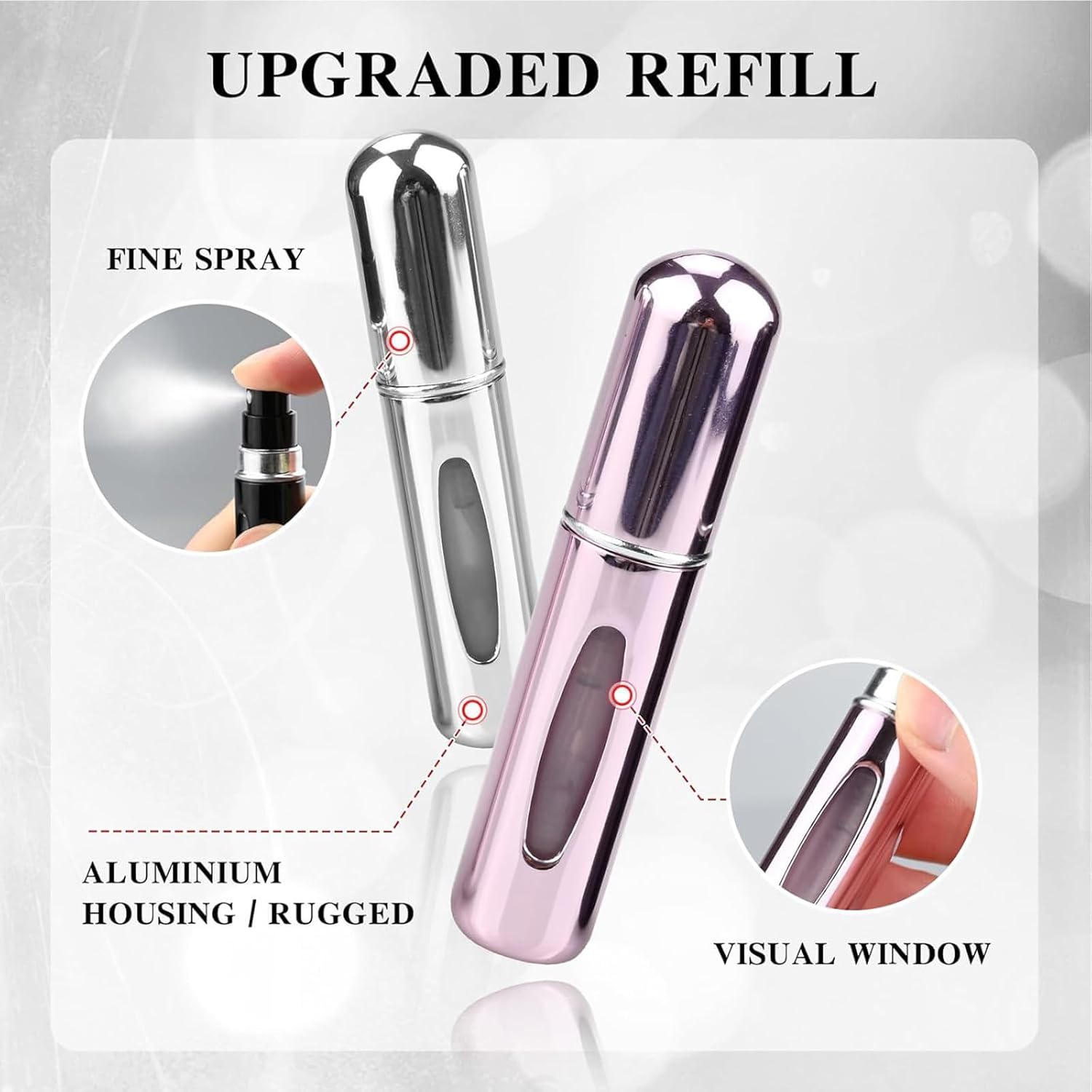 - Feito de alumínio durável feito de alumínio leve e forte, estes frascos de perfume recarregáveis portáteis são feitos para durar. Sem rachaduras, sem derramamentos — apenas armazenamento elegante e seguro de fragrâncias.