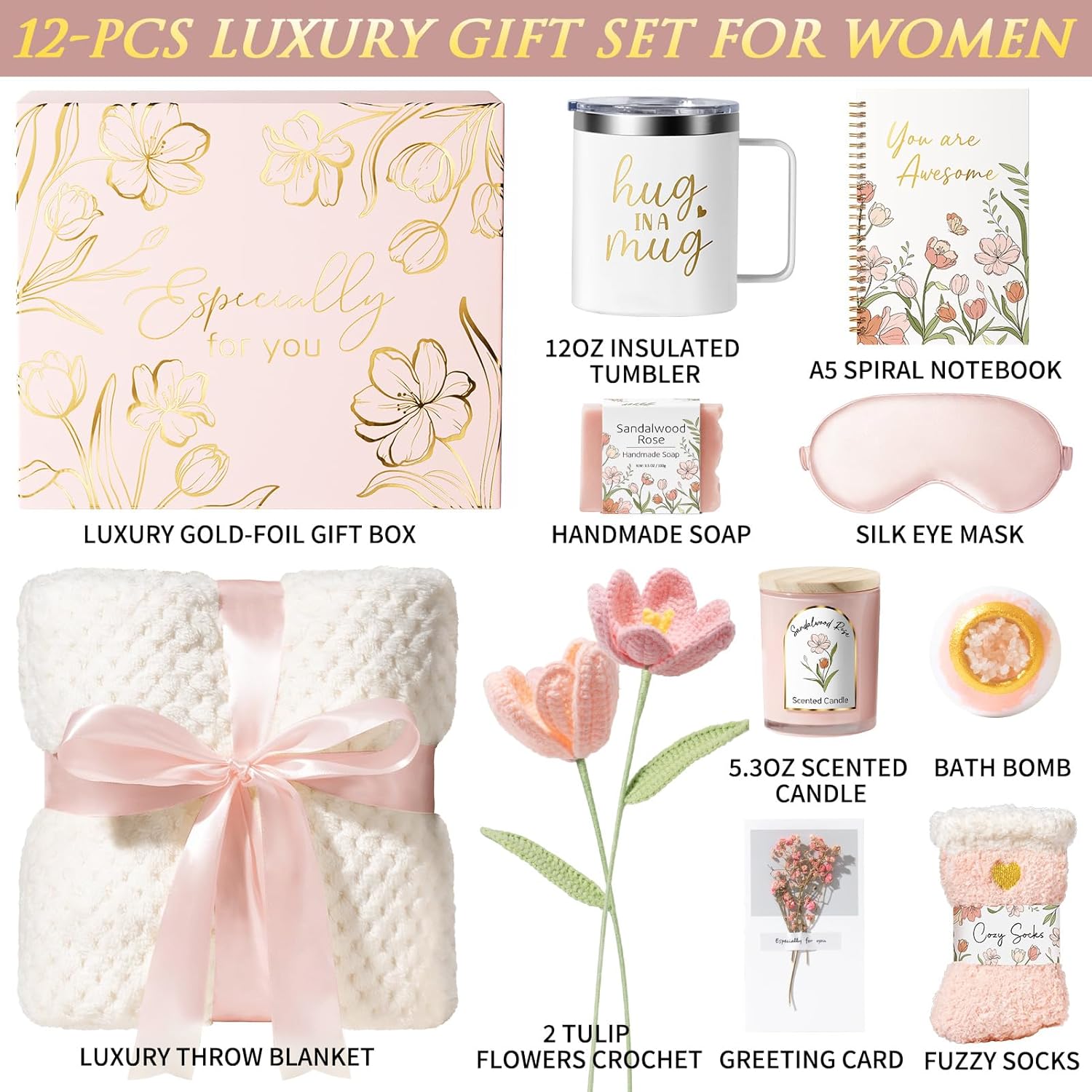 - PACOTE DE 12 PÇS DE CUIDADOS PARA MULHERES: O conjunto de presentes de aniversário do Dia das Mães de Natal da MAYICIVO apresenta itens de luxo cuidadosamente escolhidos, incluindo cobertor de luxo de 99 x 149 cm, copo isolado de 340 g com alça, vela perfumada de rosa de sândalo de 150 g, caderno espiral A5, sabonete artesanal, bomba de banho, 2 tulipas de crochê feitas à mão rosa, fuligem meias zzy, olho de seda máscara, cartão de presente de flores secas e caixa de presente elegante. Um presente exclusivo de agradecimento para se sentir melhor, cestas de simpatia para mulheres, mães, amigas