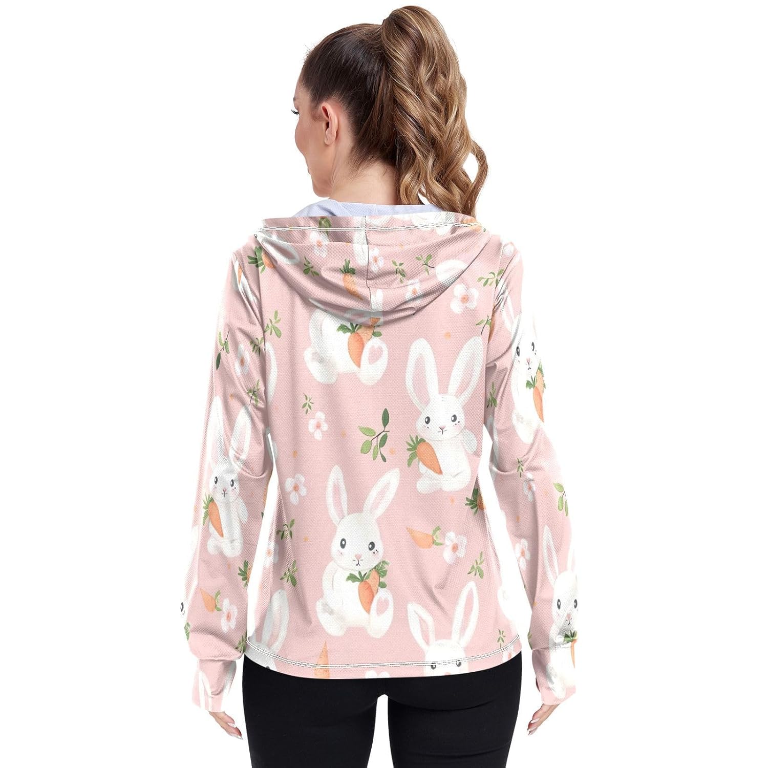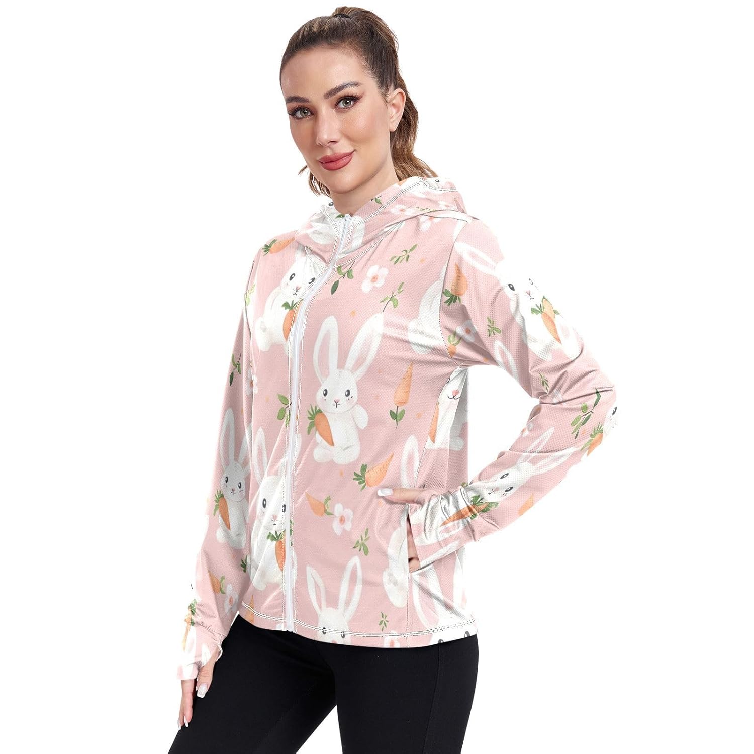Qilmy Carrots and Rabbits feminina FPS 50+ proteção solar UV com capuz com zíper FPS manga longa camisa de sol 355