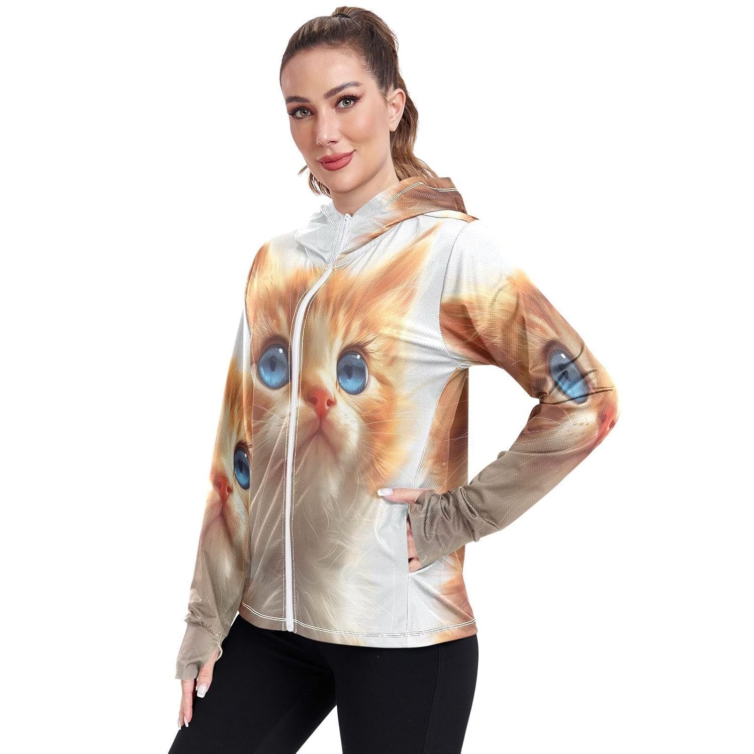 Especificação: Qilmy Lindo gato laranja de olhos azuis FPS 50+ roupa de proteção solar UV moletom com capuz FPS manga longa camisa de sol 499