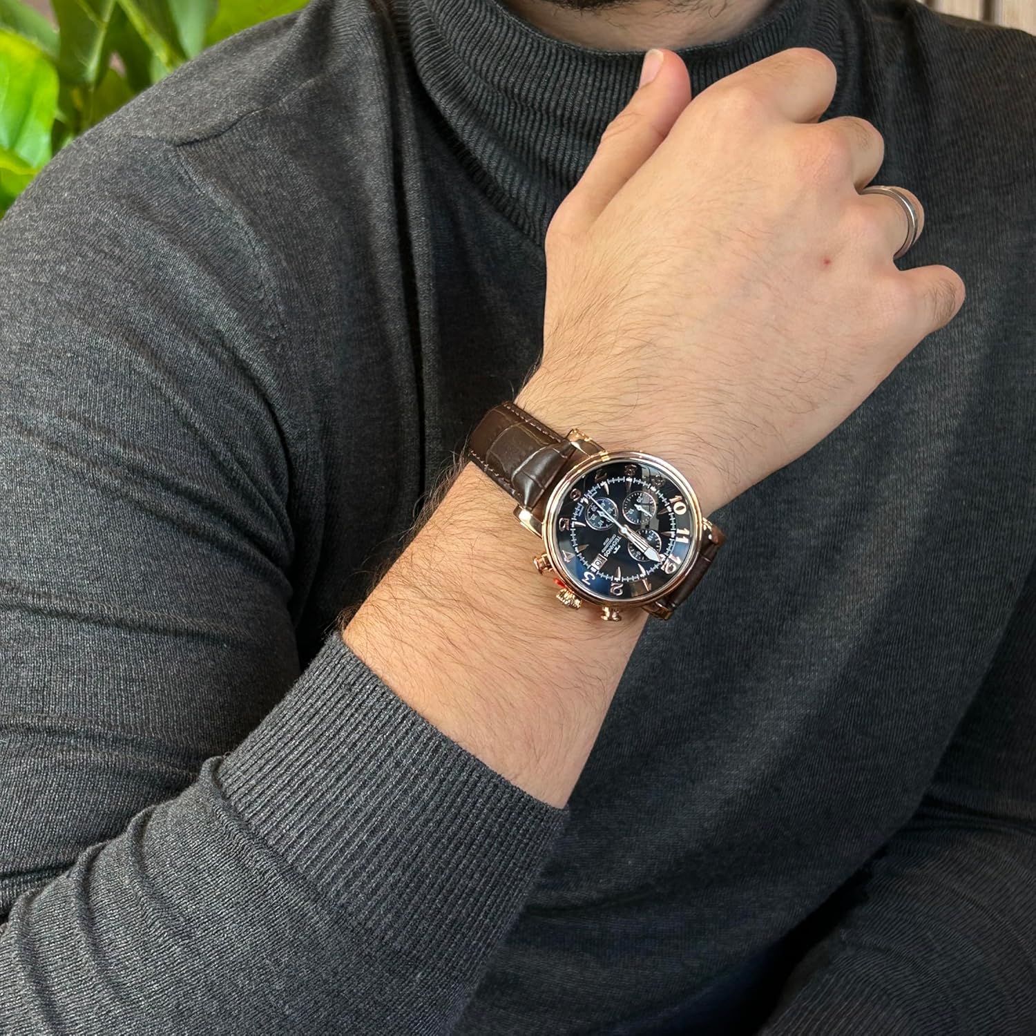 - Confeccionado em aço inoxidável rosê, com pulseira em couro marrom