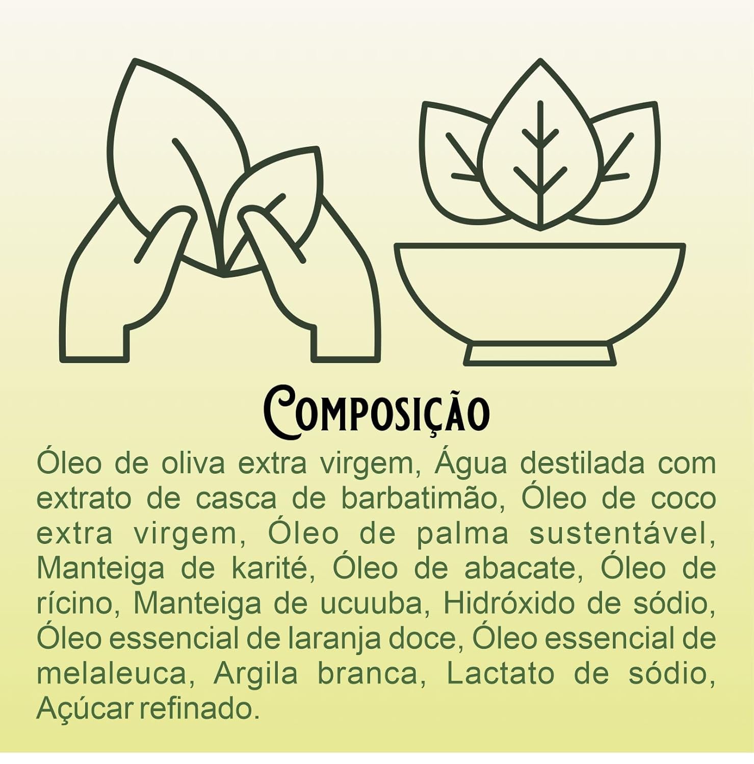 - Infusão natural de casca de Barbatimão: Conhecido por suas propriedades adstringentes, antimicrobianas e cicatrizantes, promove limpeza profunda sem agredir a pele.