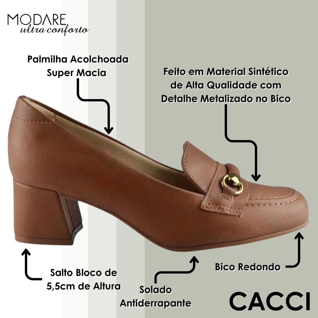 - Com design elegante e toque moderno, este modelo da Modare combina conforto e sofisticao em cada detalhe. O salto bloco de 5,5 cm oferece a altura ideal para quem busca estabilidade e estilo ao mesmo tempo, sendo perfeito para acompanhar sua rotina com leveza e segurana. O bico redondo confere um visual delicado e atemporal, tornando o calado uma pea verstil para diversas ocasies. A palmilha super macia proporciona uma sensao de bem-estar a cada passo, envolvendo os ps em conforto desde o primeiro uso. J o solado antiderrapante garante firmeza ao caminhar, mesmo em superfcies lisas, contribuindo para uma experincia mais segura ao longo do dia. Tudo pensado para tornar sua caminhada mais leve